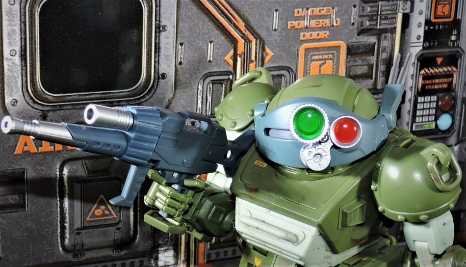 The SCOPEDOG comes with its signature GAT-22 30mm heavy machine gun w/grenade launcher. Expansion sets include the Round Mover and Red Shoulder Custom which will be reviewed later this holiday weekend.