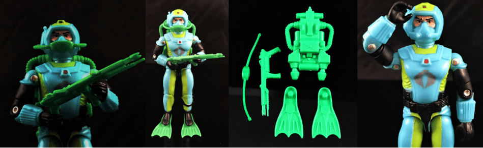 The Copperhead Swamp Eel really POPS, sporting a teal and bright green uniform with black accents and red highlights. He has a silver cobra emblem, similar to that of Copperhead, that seems to just float of off his wet suit.