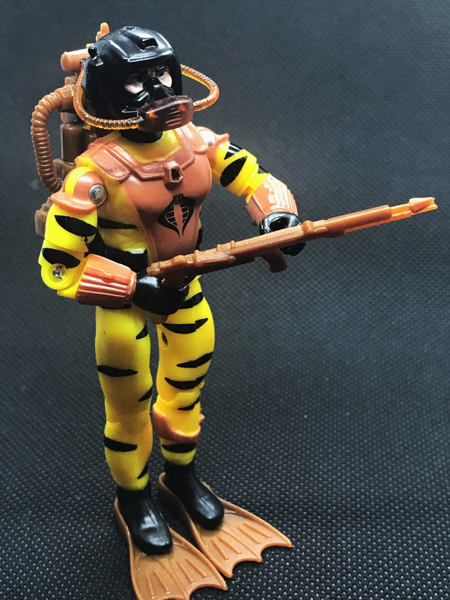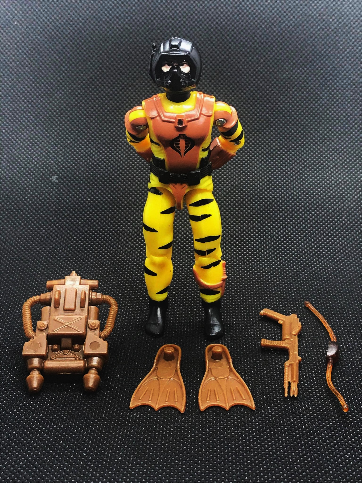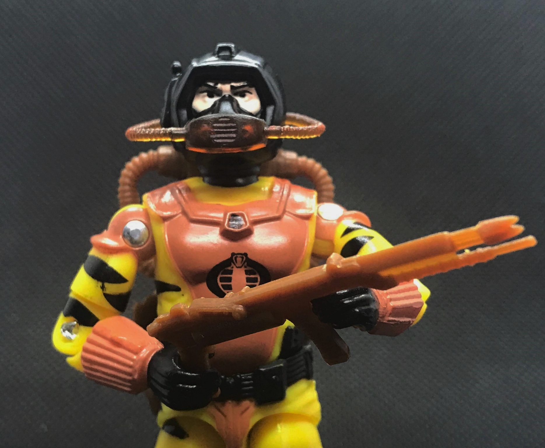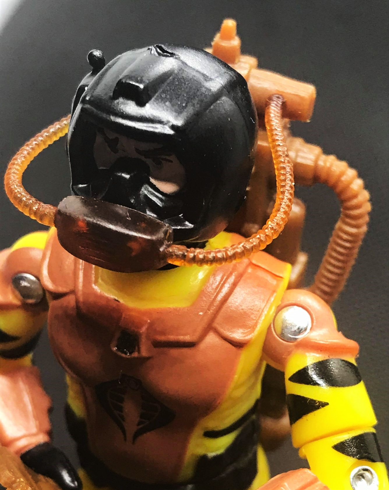 This Eel build is the same as his ’85 predecessor, with standard articulation at the head, arms (shoulders/biceps/elbows), waist, and knees. The QC on my figure was great, save for a bit of paint flash on some of the tiger stripes. Eh, no harm, no foul. His breather hose isn’t exactly snug, but stays in place once you get it there.