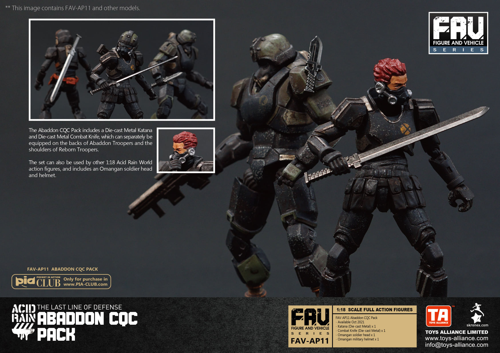 The Abaddon CQC Pack includes a Die-cast Metal Katana and Die-cast Metal Combat Knife, which can separately be equipped on the backs of Abaddon Troopers and the shoulders of Reborn Troopers. The set can also be used by other 1:18 Acid Rain World action figures, and includes an Omangan soldier head and helmet.