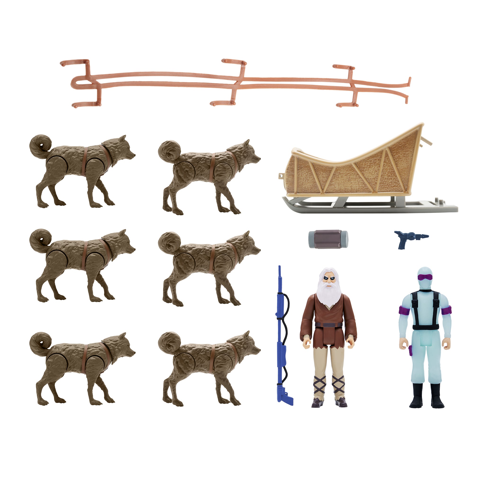 - Includes Snake Eyes and Blind Woodsman ReAction figures and accessories, dog sled, and six sled dogs