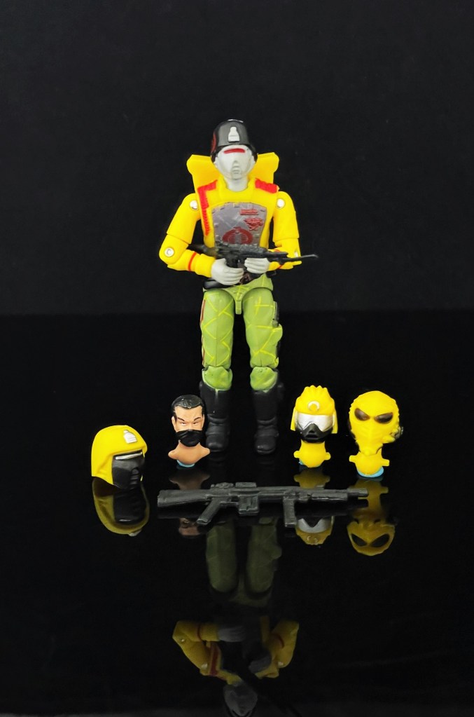 Now, let’s talk QC – Outside of a loose left arm and a few molding lines in my CGI mask, the only real issue is with a bit of sloppiness when it comes to paint apps. Other than that, he’s able to hold his weapons without issue. Speaking of weapons, the 2021 Black Major Crimson Guard Assortment includes a TON of goodies, namely an assortment of additional heads and a Viper assault rifle to hit the battlefield with. These weapons are, of course, alongside the classic Crimson Guard Rifle & Back Pack. The heads included are –