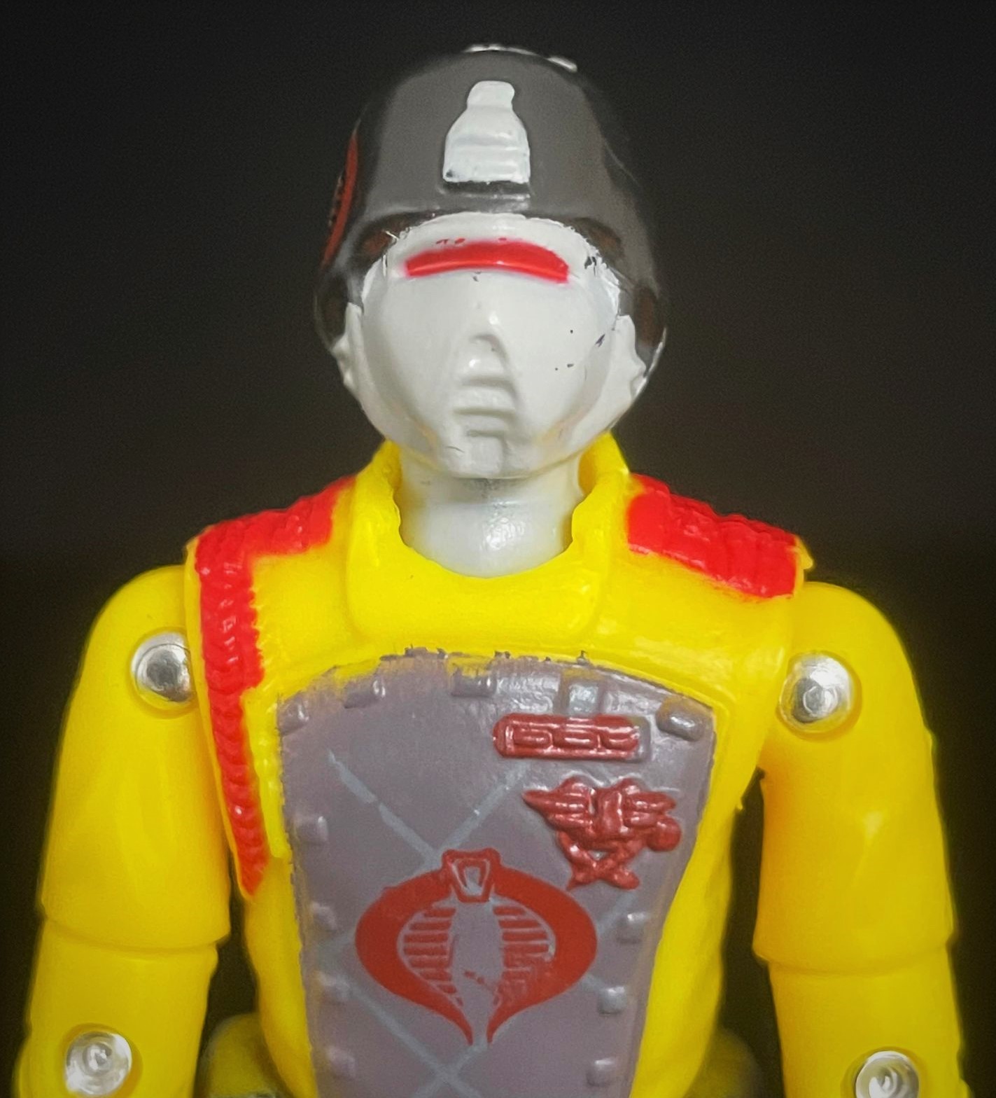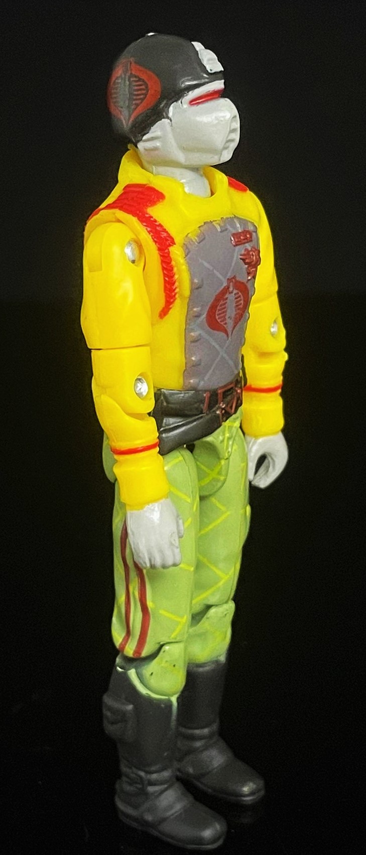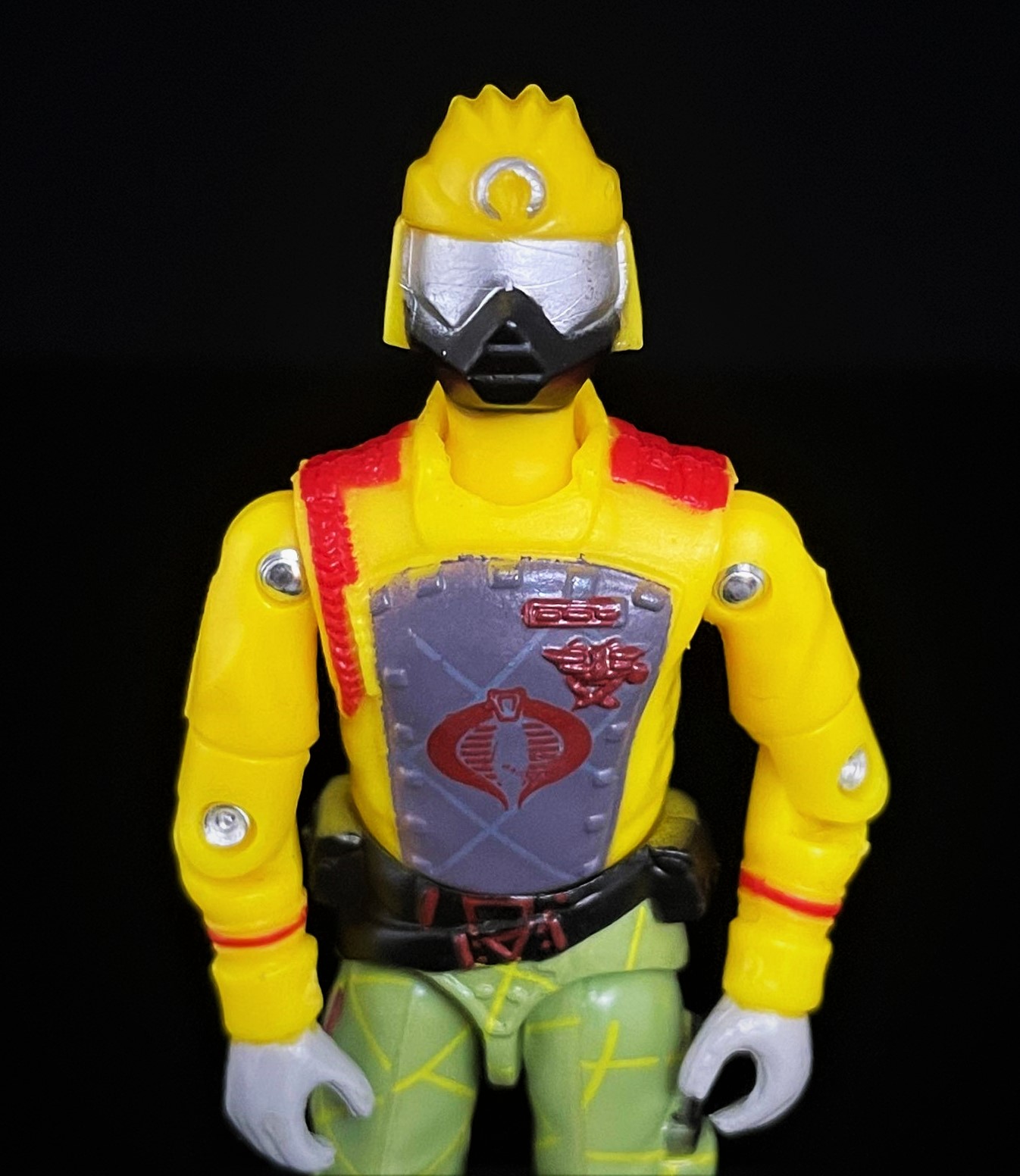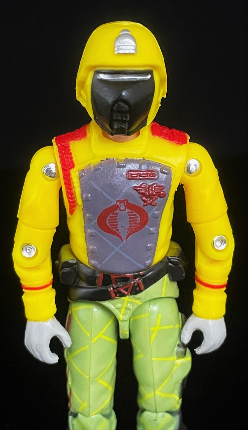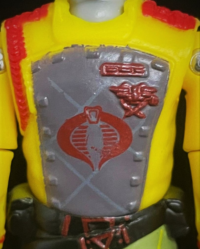 At first glance, one can see that this CG matches his 1989 counterpart pretty closely. The Python Crimson Guard’s uniform here is much brighter, with a richer yellow & green used in his uniform. He also has that distinct python striping on his pants, along with a cobra logo on his helmet. Alongside other subtle paint touches, it’s easy to distinguish the two apart.