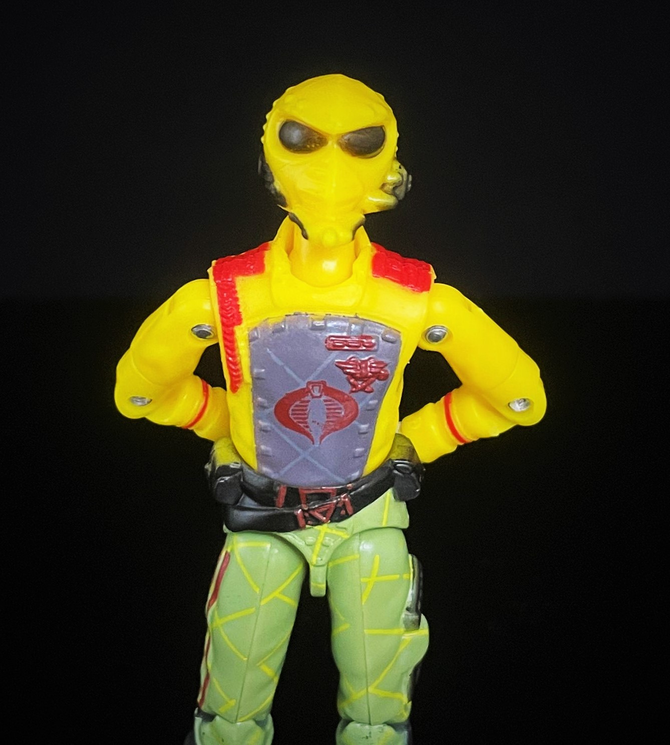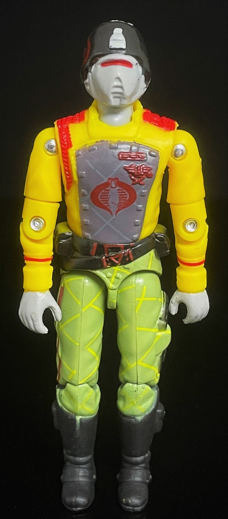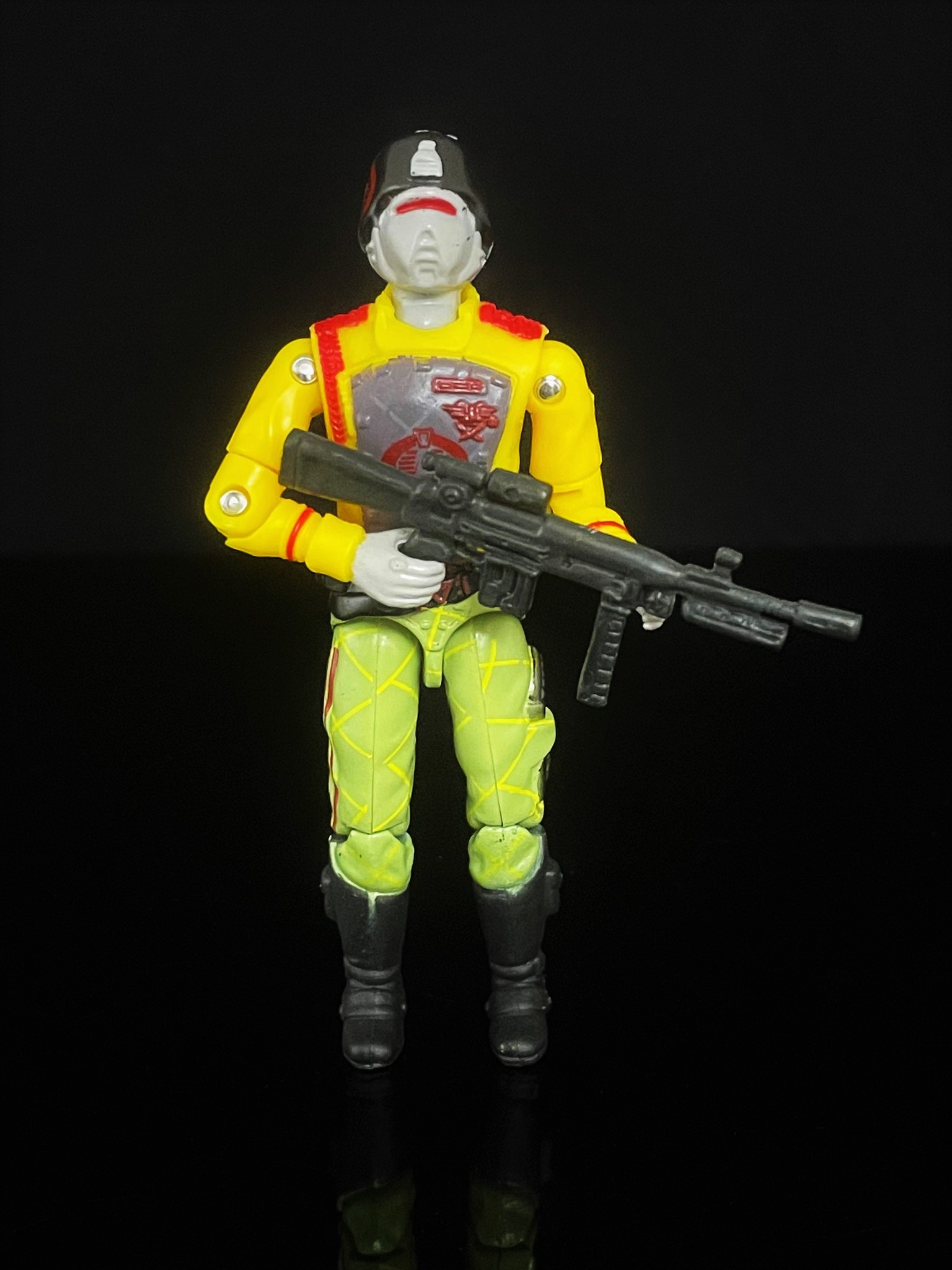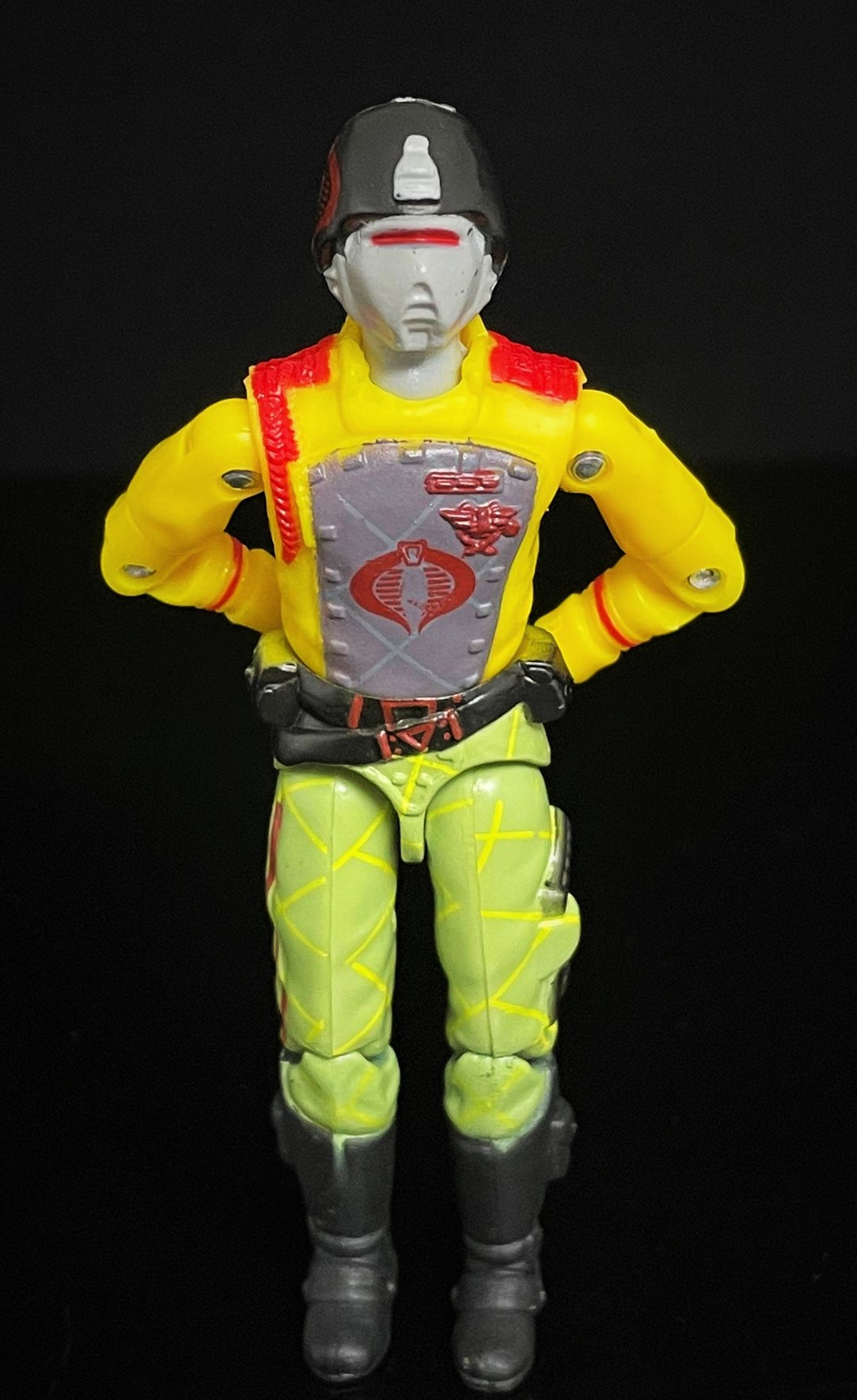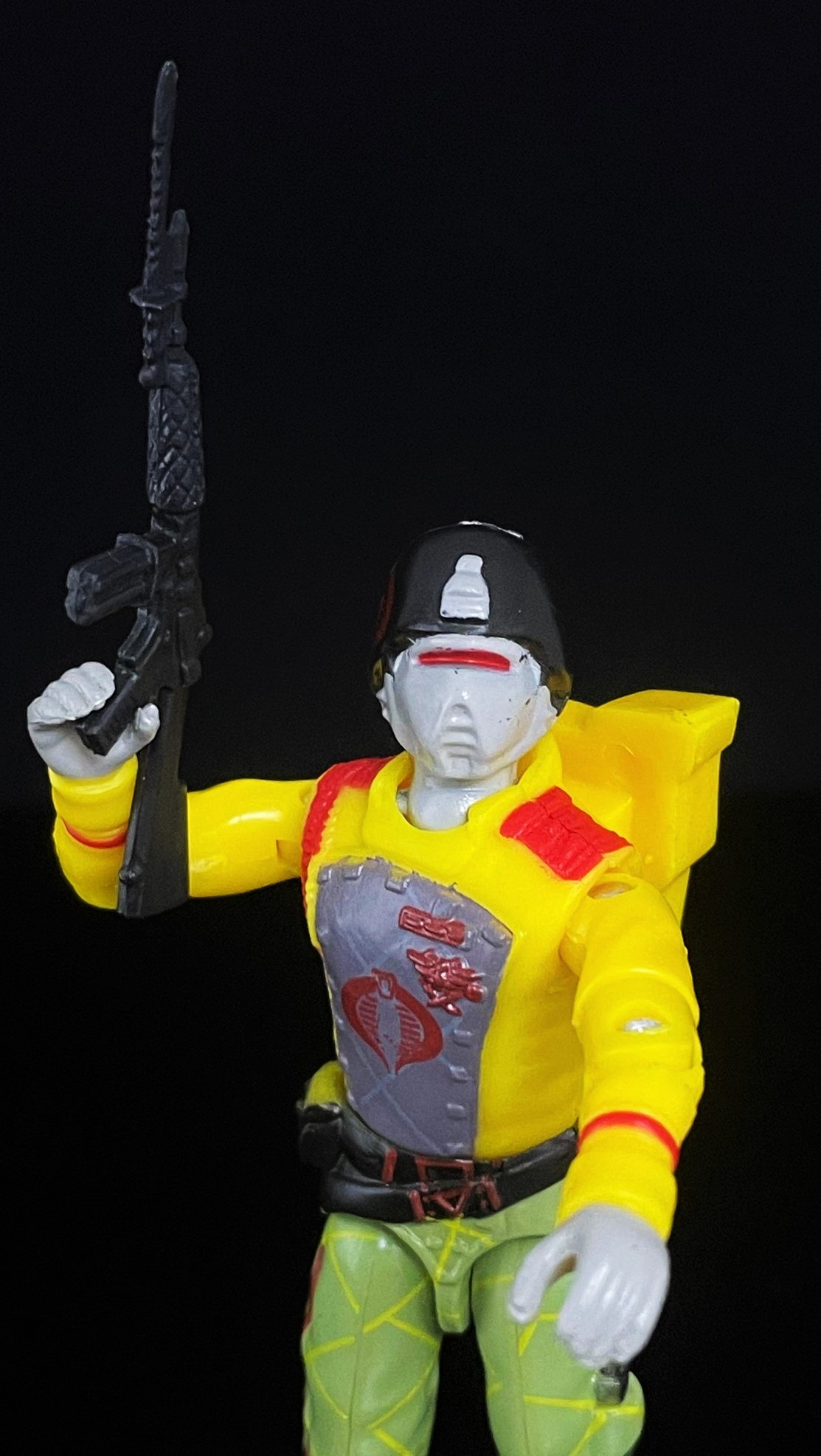 At first glance, one can see that this CG matches his 1989 counterpart pretty closely. The Python Crimson Guard’s uniform here is much brighter, with a richer yellow & green used in his uniform. He also has that distinct python striping on his pants, along with a cobra logo on his helmet. Alongside other subtle paint touches, it’s easy to distinguish the two apart.