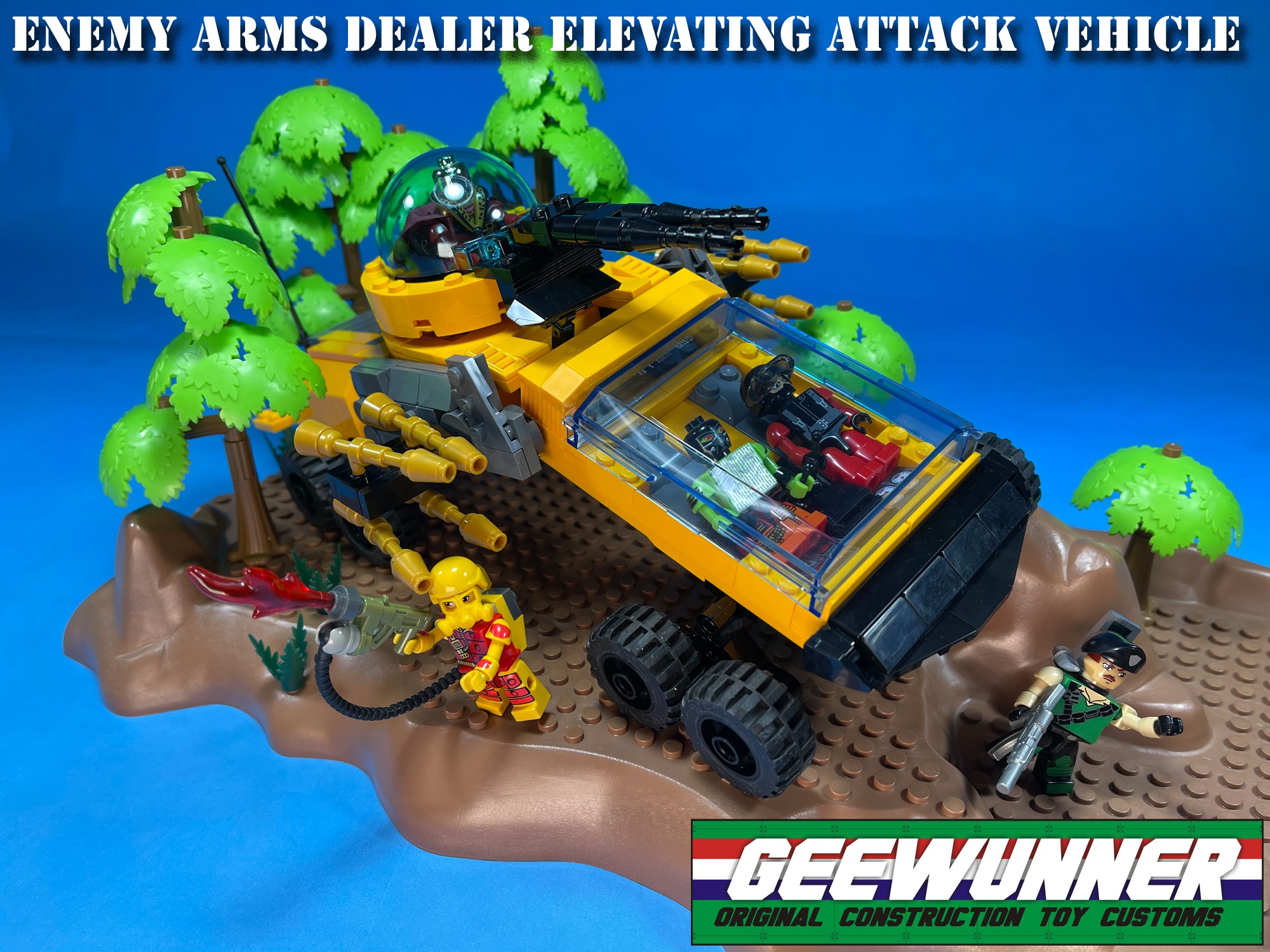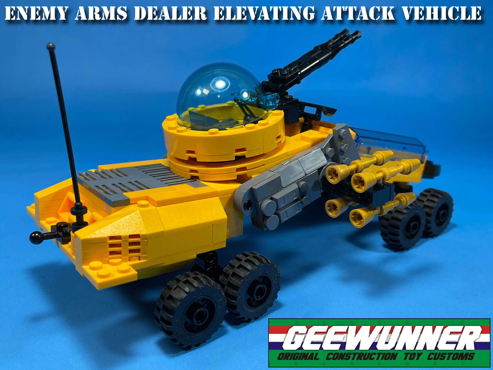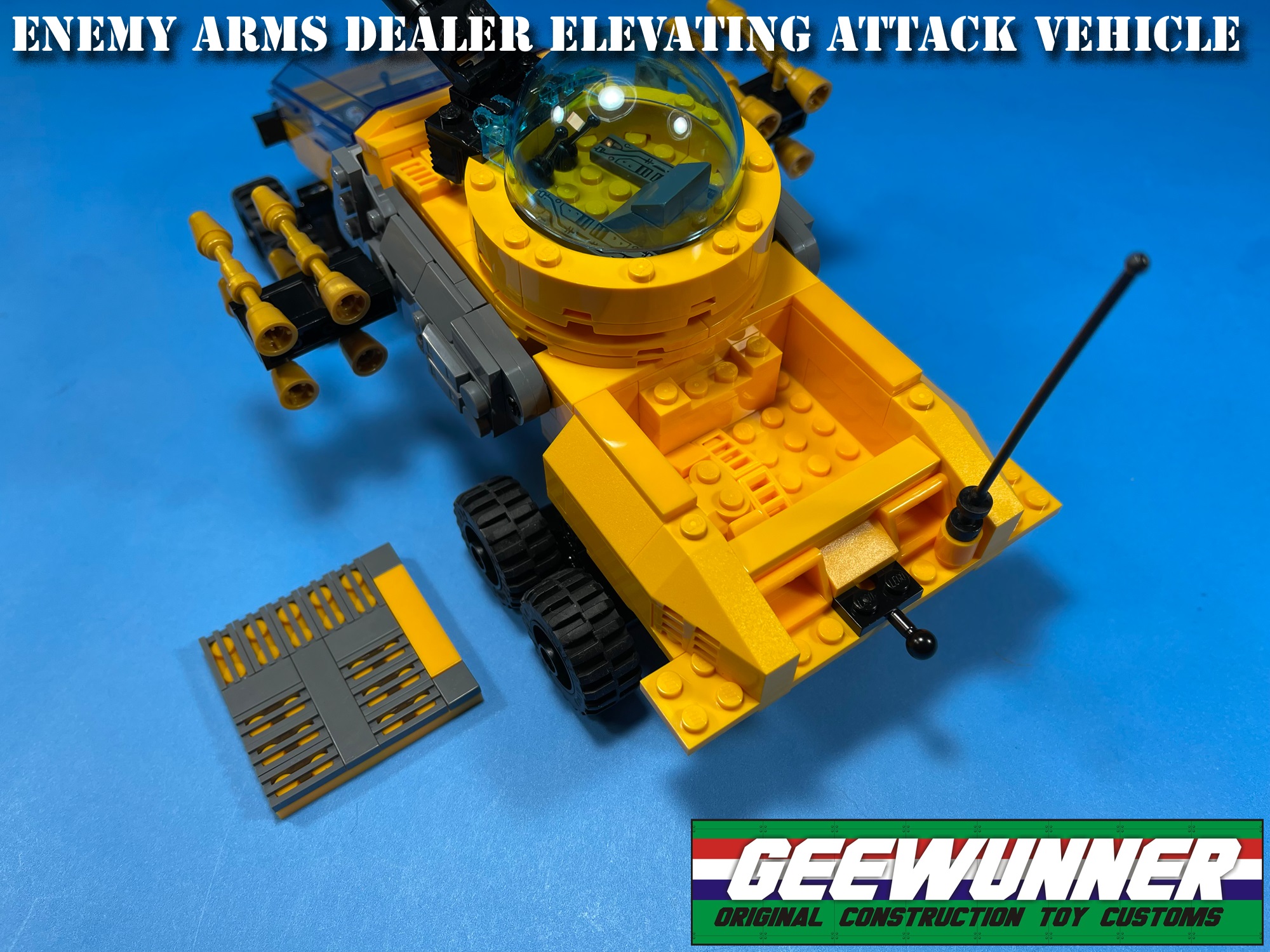 The Enemy Arms Dealer slices like a razor down the back of the Heroes with the Elevating Attack Vehicle! Features include the obvious elevating mechanism, seating for two figures in the cockpit, one in the 360-rotating turret bubble, rotating missiles racks with eight removable missiles, elevating sensor bar, removable engine/storage cover, and more! Approx. 369 parts.