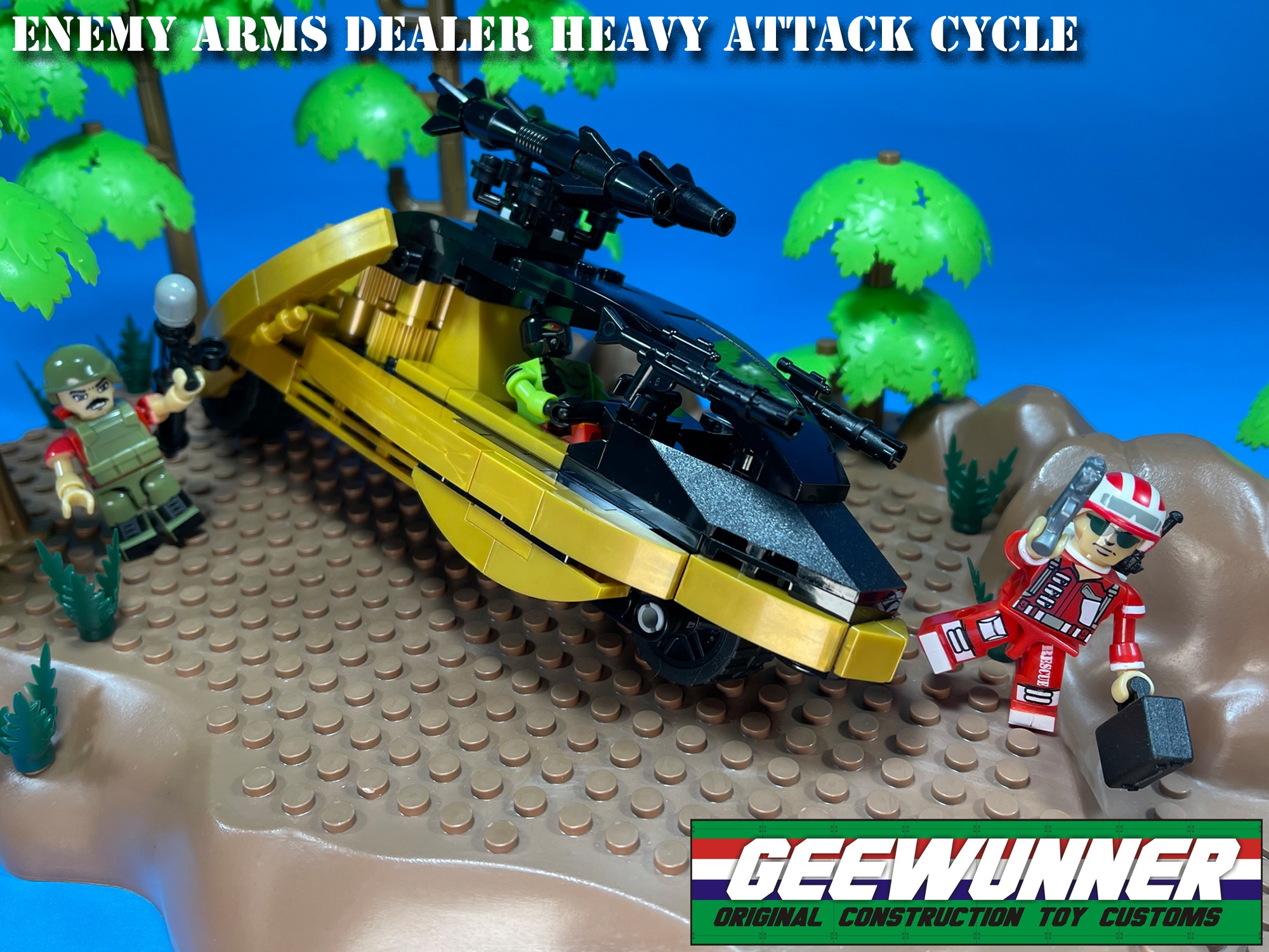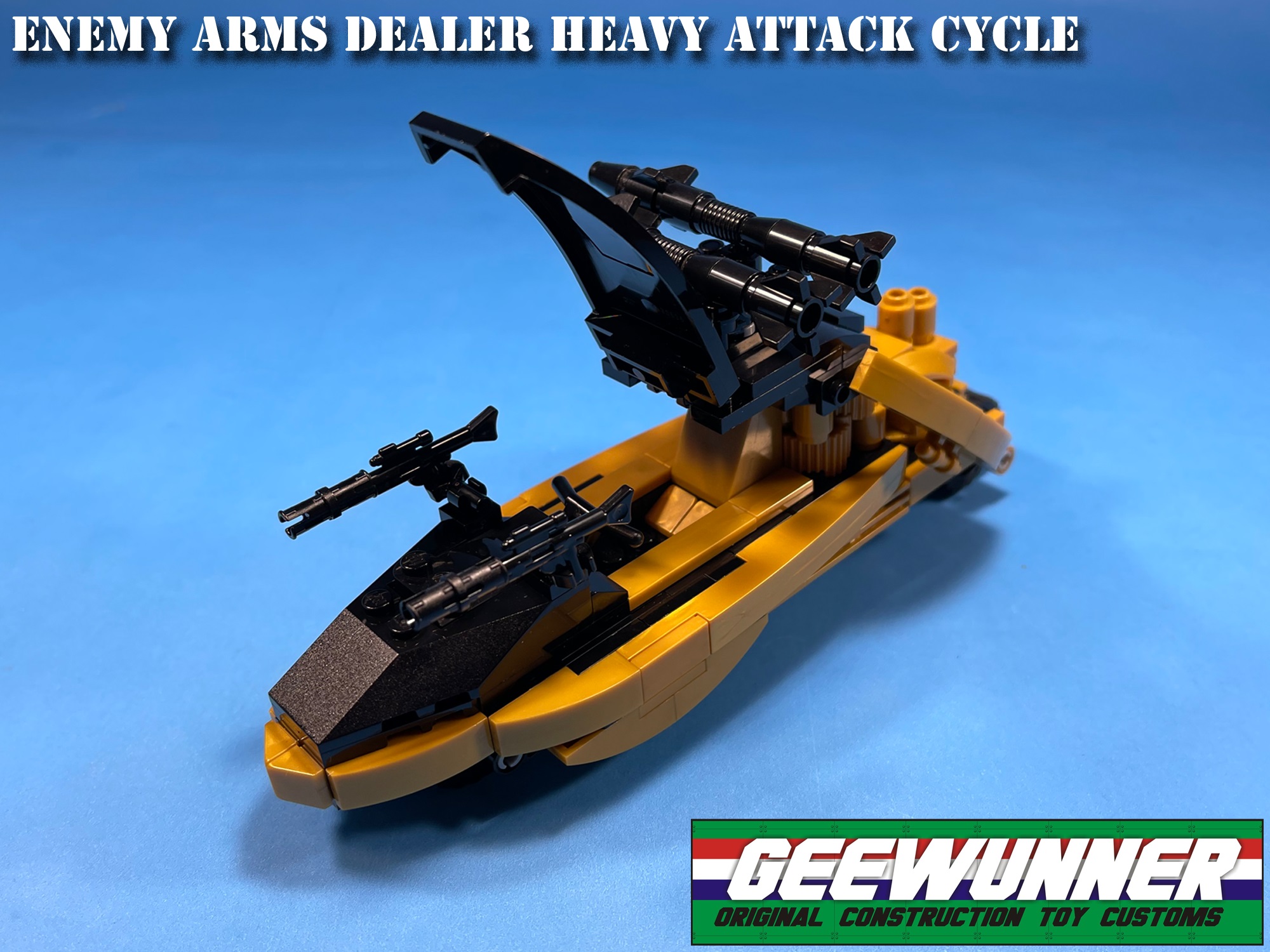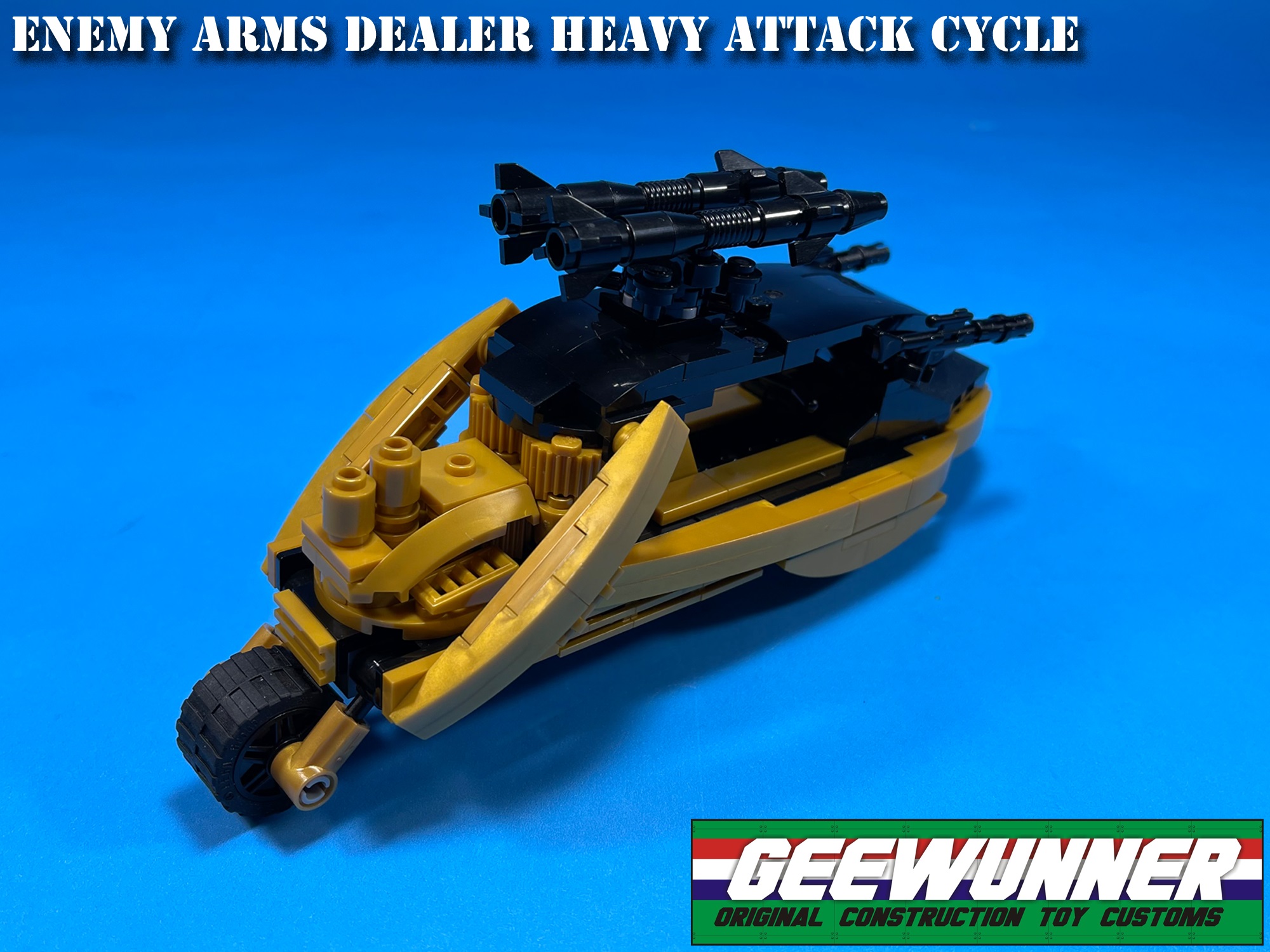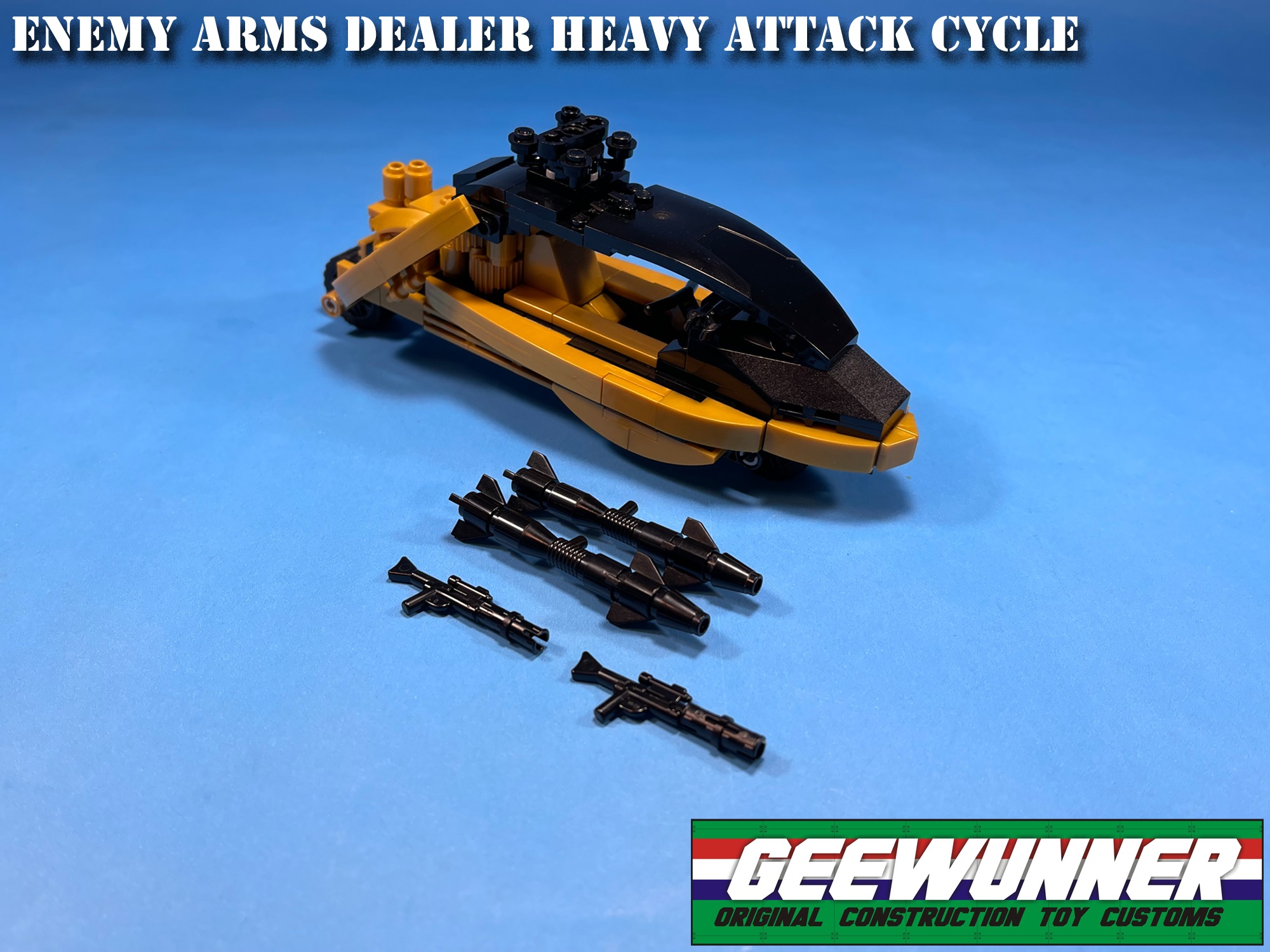 The Enemy Arms Dealer’s head thug evades capture by the Heroes in the Heavy Attack Cycle! Features include seating for one figure, storage for his rifle underneath, an opening canopy (for ease of placement of figure), swiveling front guns, and rotating missile rack with two removable missiles. Approx. 194 parts.