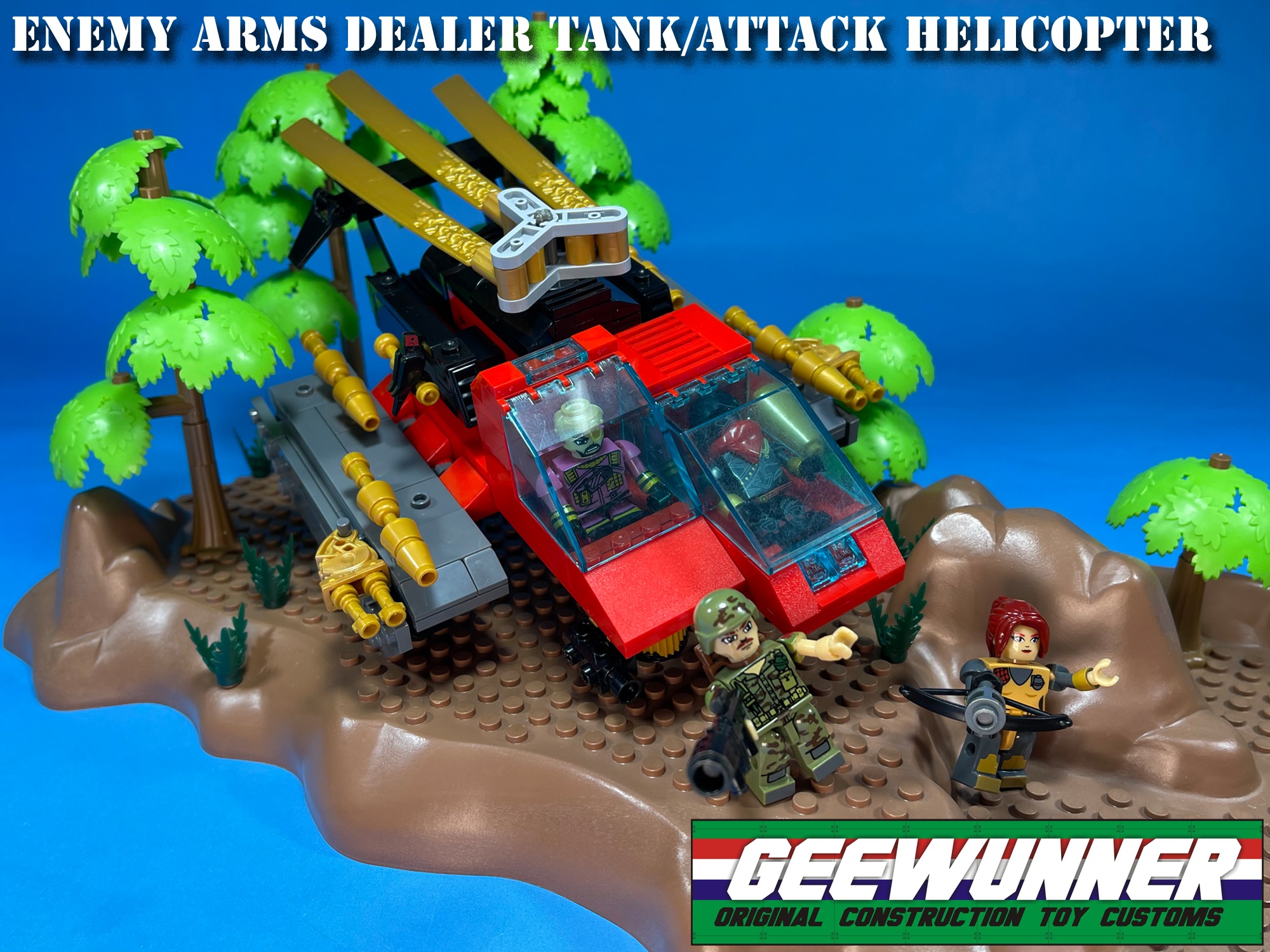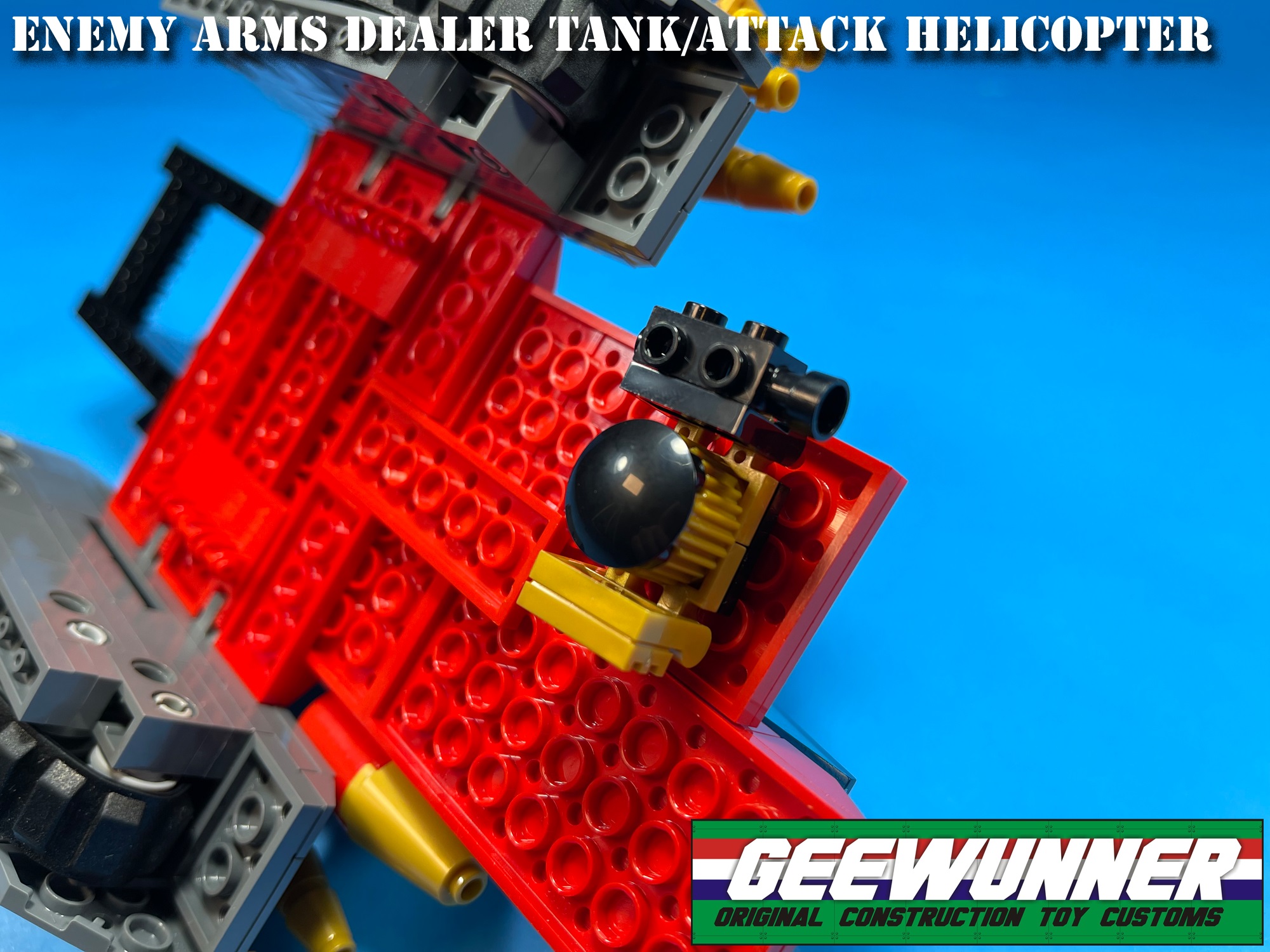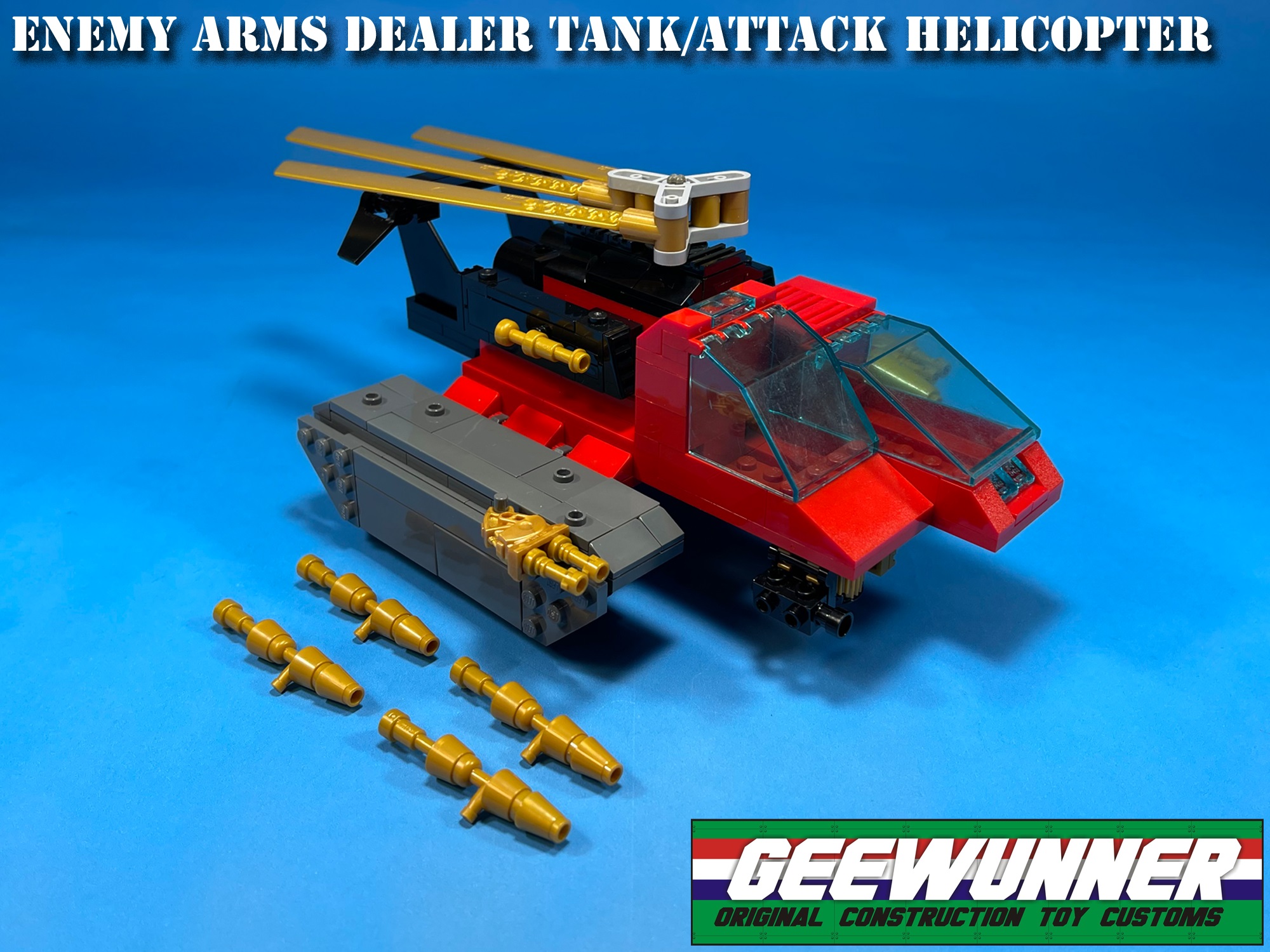 The Enemy Arms Dealer displays total domination over the Heroes with the Tank/Attack Helicopter! This dynamic vehicle includes many features; first and foremost is its ability to transform from tank to helicopter, as well as seating for one figure in each of the cockpits, room for more figures along the tread wells, four removable missiles, chin turret, positionable side cannons, rotating blades, and moving treads. Approx. 374 parts.