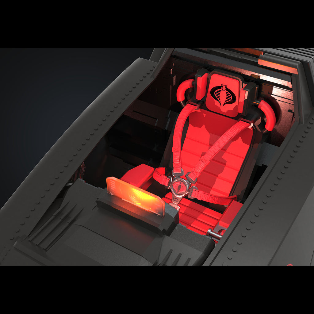 - Elaborately-detailed command cockpit interior: The Cobra H.I.S.S. Driver Action Figure sits buckled with a 5-point harness adorned with Cobra logo before an illuminated control panel. You can pose the figure operating the articulated joystick and throttle controls while targeting Joe combatants.