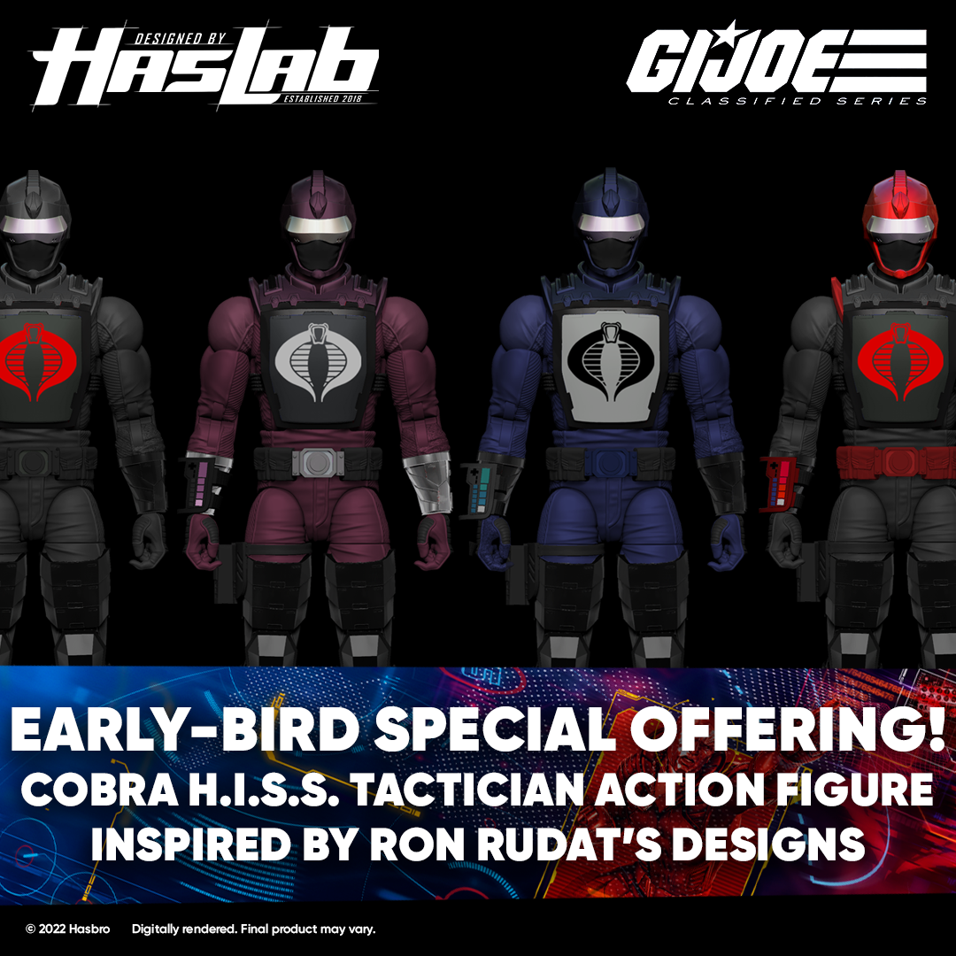 The Baroness is fond of reminding me of that insipid platitude of the early bird getting the worm, but in this instance, it seems rather fitting since you all successfully funded our H.I.S.S. so fast! Such victory over G.I. Joe has earned ALL backers of this #HasLab an exclusive Cobra H.I.S.S. Tactician figure with deco inspired by the designs of legendary G.I. Joe designer Ron Rudat – the very man who put me, Destro, in an iron mask. To commend your loyalty to Cobra, backers will get to help choose the color-scheme inspiration for the final deco of the Tactician figure after the campaign ends. And remember, each figure included in the offering is exclusive to the HasLab, and will be individually boxed with its own artwork and number in the G.I. Joe Classified Series sequence.