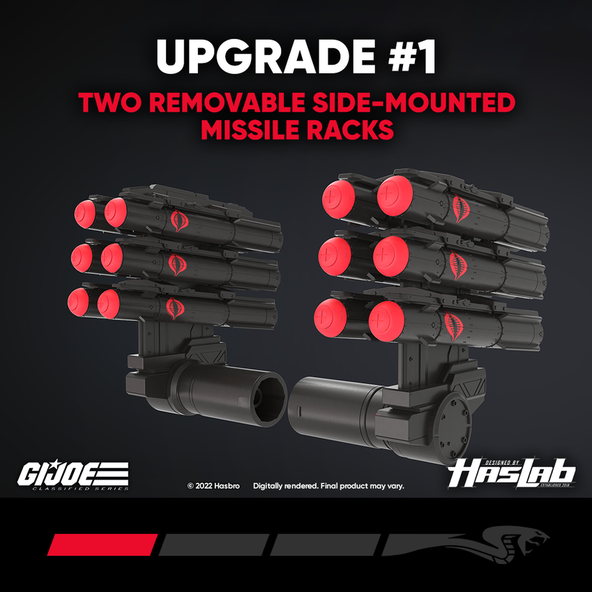 Congratulations, citizens of Earth! You’ve passed the firsssst step in proving your devotion to me, Cobra Commander, by successssssfully funding our HasLab Cobra H.I.S.S. campaign and reaching 10,000 backerssss, thus unlocking the FIRST Classified Upgrade! The Double Diablo Cannon accessories on your standard H.I.S.S. are indeed formidable, but Destro and Sssscrap Iron have been cooking up plans that will enssssure the Joes demise! Your Cobra H.I.S.S. will now include two removable, side-mounted missile racks, which telescope out from the vehicle. Each rack holds 6 MALHISS missile accessories! The weapons accessory pack upgrade is a perfect addition to your H.I.S.S. fleet and is sure to wreak havoc with the forcessss of G.I. Joe. But keep those orders coming, my friendssss, and we’ll see what else Cobra Commander can unearth for you!