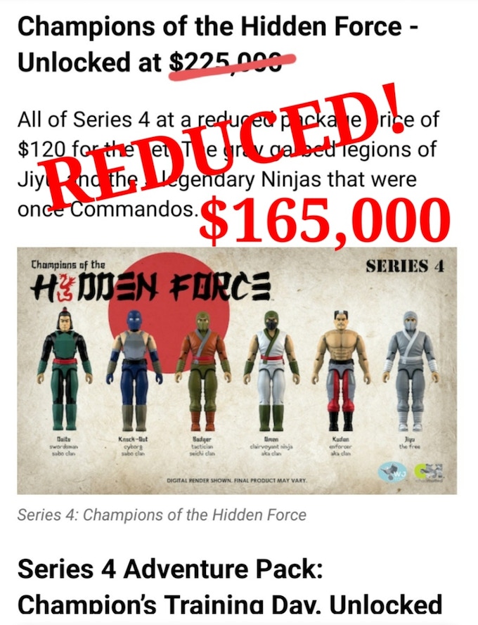 To help drive the campaign over its initial funding goal line, the team at Whiskeyjack toys have shared word that the Champions of the Hidden Force, a series of figures that page homage to the unreleased G.I.Joe Ninja Commandos, have been reduced in price and will unlock at $165,000!