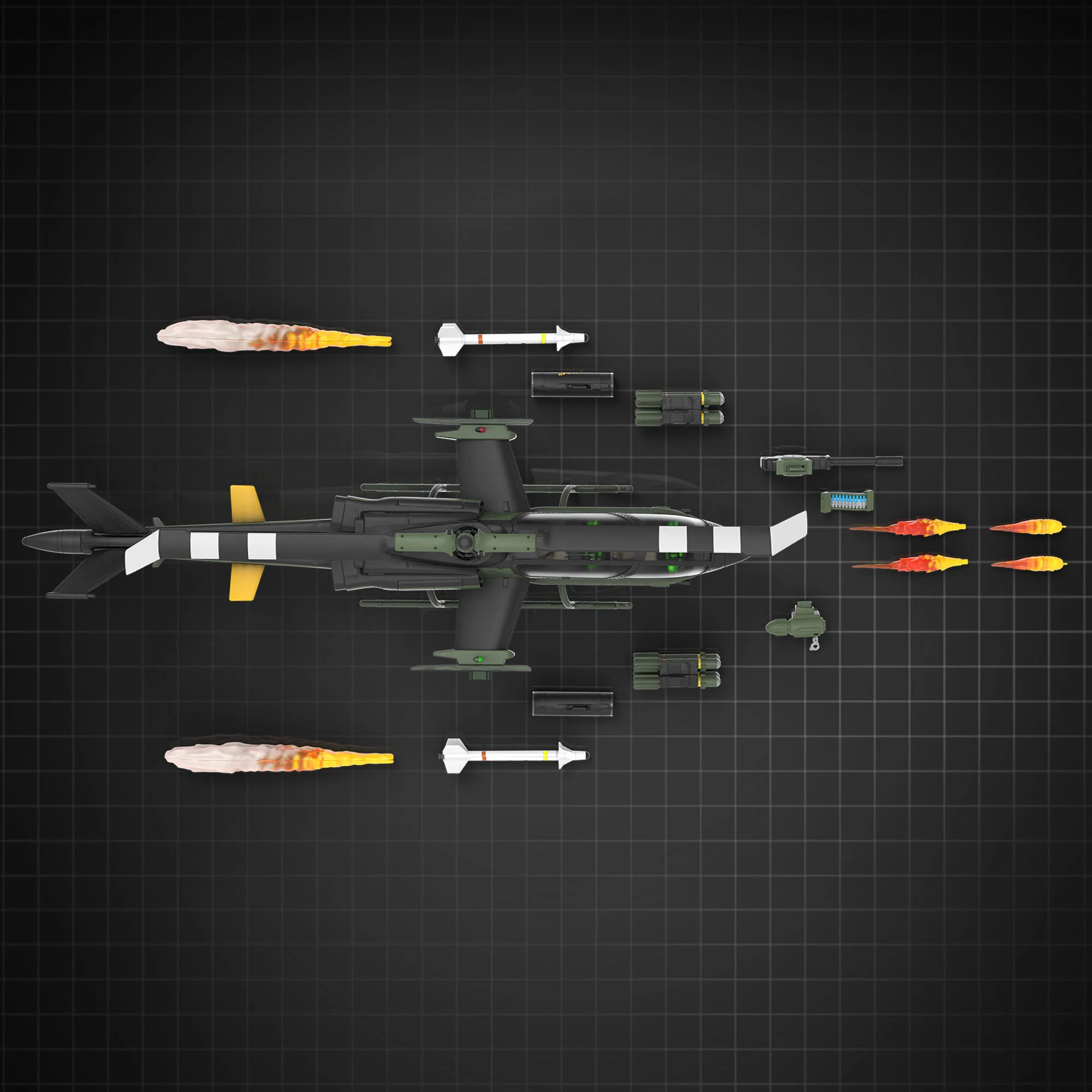 · Elaborately-detailed Command Cockpit Interior: The copter pilot and gunner sit buckled with a 4-point harness in front of specialized illuminated instrument control panels. You can pose each figure operating the center, floor-mounted control stick and throttle controls maneuvering around and locking in on an oncoming H.I.S.S.