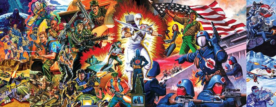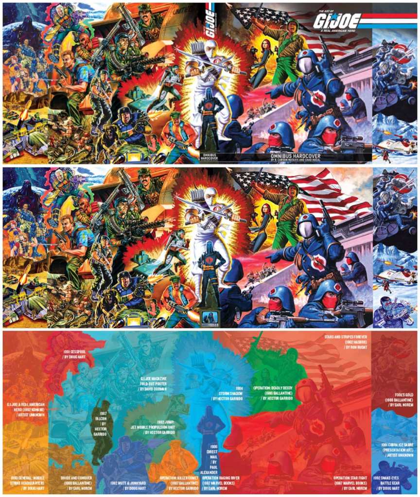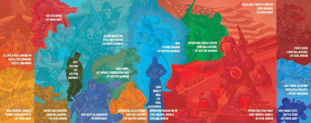This dust jacket features a wraparound collage of paintings by every major illustrator that contributed to the brand. Shown clockwise from the top-left corner below are 1991 Cesspool by Doug Hart, G.I.JOE Magazine fold-out poster by David Dorman, 1984 Storm Shadow by Hector Garrido, Operation: Deadly Decoy (1986 Ballantine) by Hector Garrido, Stars and Stripes Forever (1982 Hasbro) by Ron Rudat, Fool’s Gold (1988 Ballantine) by Earl Norem, 1991 Cobra Ice Sabre presentation art (artist unknown), 1992 Snake-Eyes Battle Gear by Doug Hart, Operation Star Fight (1987 Marvel Books) by Earl Norem, Operation Raging River (1987 Marvel Books) by Earl Norem, 1986 direct mail by Paul Alexander, Operation: Killer Comet (1987 Ballantine) by Hector Garrido, 1982 JUMP: Jet Mobile Propulsion Unit by Hector Garrido, 1992 Mutt & Junkyard by Doug Hart, 1987 Falcon by Hector Garrido, Divide and Conquer (1988 Ballantine) by Earl Norem, 1990 General: Mobile Strike Headquarters by Doug Hart, and G.I.JOE: A Real American Hero (1992 Konami, artist unknown).