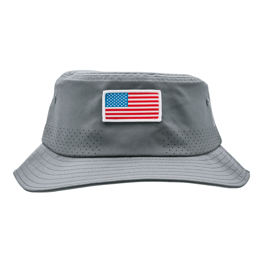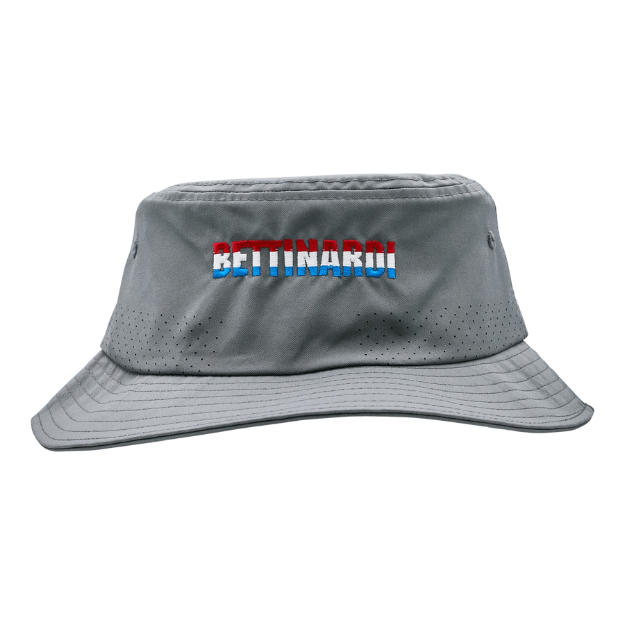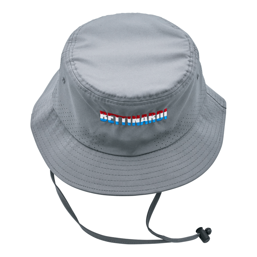 Take the fight to the front lines with the Bettinardi x G.I. Joe collection! This cooling bucket hat is the perfect headgear for a trek into any enemy-filled jungle. The front features an American flag patch while the back features our tri-color Bettinardi wordmark. This 100% polyester cooling bucket hat cools up to 30% cooler than skin when wet and has additional perforation around the crown for added ventilation. Finished with an adjustable, removable chinstrap. Limited quantities are available. Limit 1 per person. Good luck!