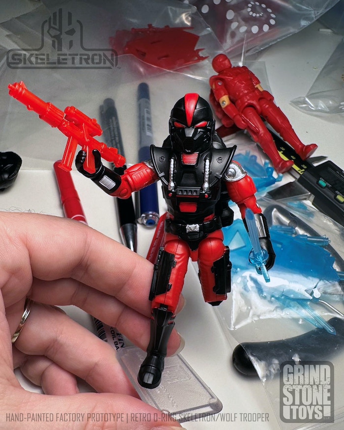 The test shot revisions for the Retro Skeletron/Wolf Trooper have now successfully concluded. Our factory team is now putting the finishing touches on the paint applications and skull & crossbones logo before we initiate full production. Here’s another glimpse of the in-process O-ring figure, nearly to its final form: