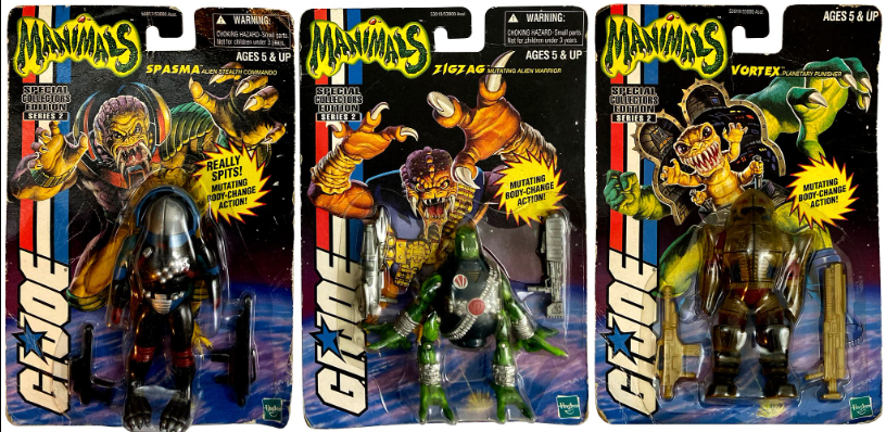 In 2001 Hasbro planned to release all six Manimals through KB Toys as a store exclusive. All six figures were modified with new paint apps, perhaps to preserve the integrity or collecter value of the canceled 1995 releases, or perhaps because tastes in colors at retail are constantly evolving. Hasbro and KB Toys planned to release the six Manimals in two waves of three, labeled Special Collectors Edition Series 1 and Series 2. Series 1 consisted of Warwolf, Iguanus and Slythor. Series 2 consisted of Spasma, Vortex, and ZigZag. Unfortunately, Series 1 performed poorly at retail and Hasbro and KB Toys canceled Series 2.