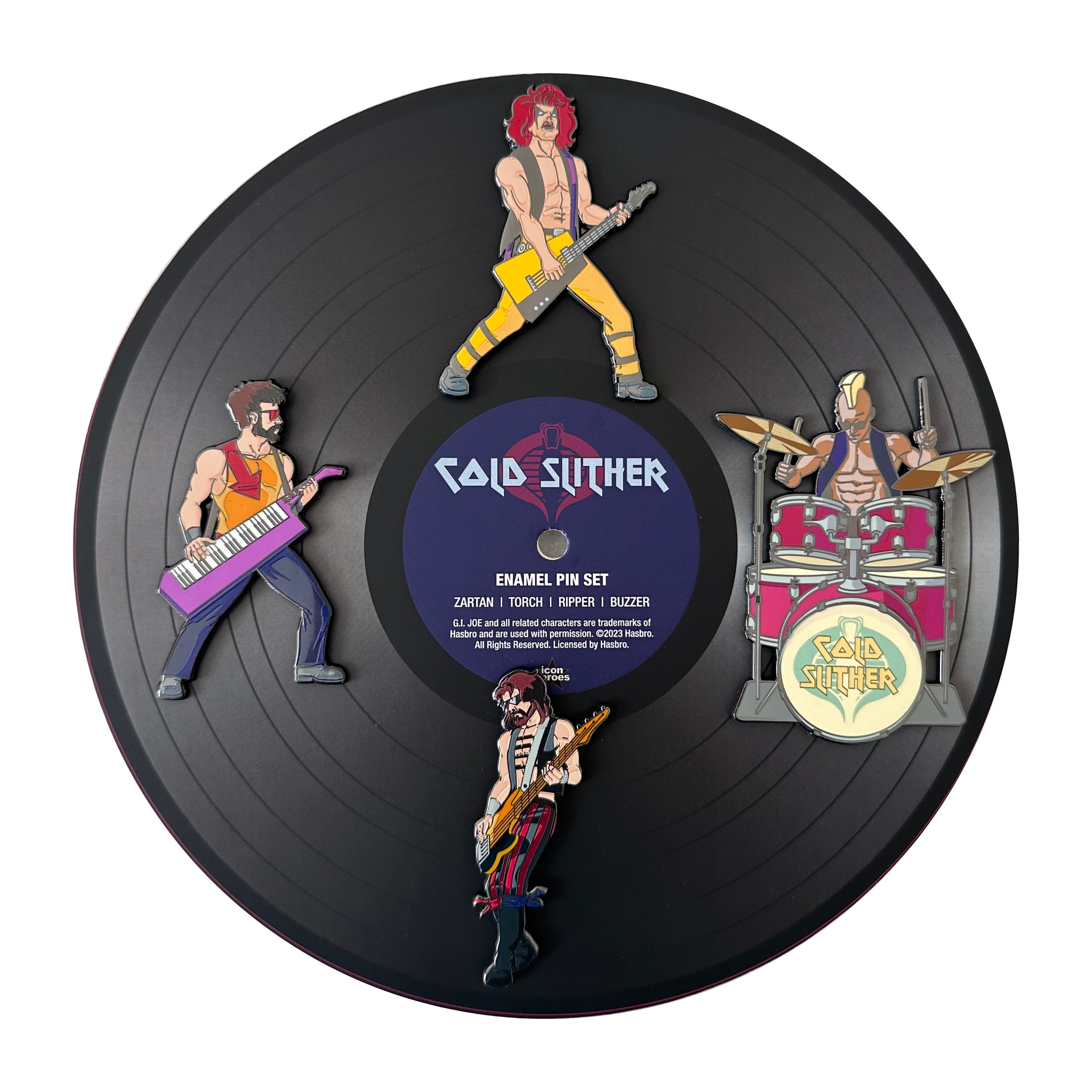 Get ready to rock with the G.I. Joe Cold Slither You’ll Be Joining Us Pins Box Set, a reissue of our popular sold out We Are Cold Slither Pin Set featuring stunning new artwork by the talented Lee Kohse. Each limited edition hard enamel pin is individually numbered, making it a true collector’s gem. But that’s not all! This box set also includes a vinyl record style backer card, an 8″ x 8″ print, and a beautifully designed box to showcase your prized possession. Inspired by the iconic ‘Cold Slither’ episode, where Zartan and the Dreadnoks brainwash listeners with subliminal messages through music, this one-of-a-kind item will take your collection to the next level. Don’t miss out on joining the ranks of true G.I. Joe enthusiasts – grab your Cold Slither Pins Box Set today!