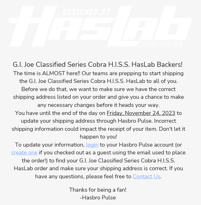Heads up! For those that backed the HasLab H.I.S.S. campaign, then check your email, as Hasbro has sent out word that our armor is being prepped for shipment! Here’s the scoop –
