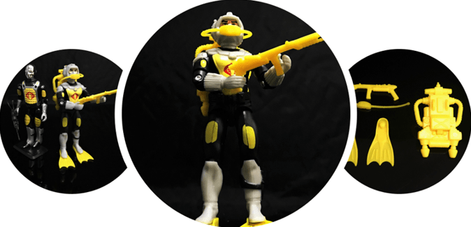 The figure features a base black wetsuit, with gray and yellow highlights. The color scheme really fits the mold well and looks right in place alongside the original.
