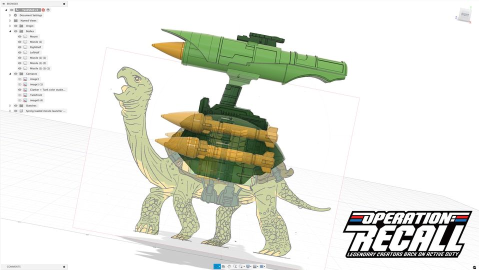 This is a sneak peek at Mark Pennington’s line art being used by Mark Gerwig as he developed the armored shell, missiles, and removable spring loaded launcher.