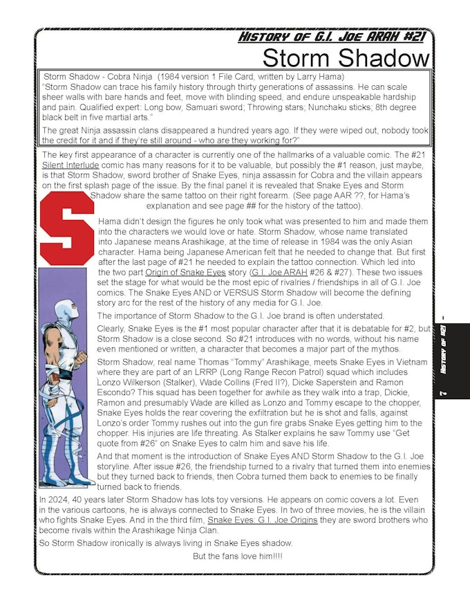 2) Larry Hama’s, “the history of how it was made” – with detailed analysis of Snake Eyes, Storm Shadow and the Arashikage Ninja Clan;