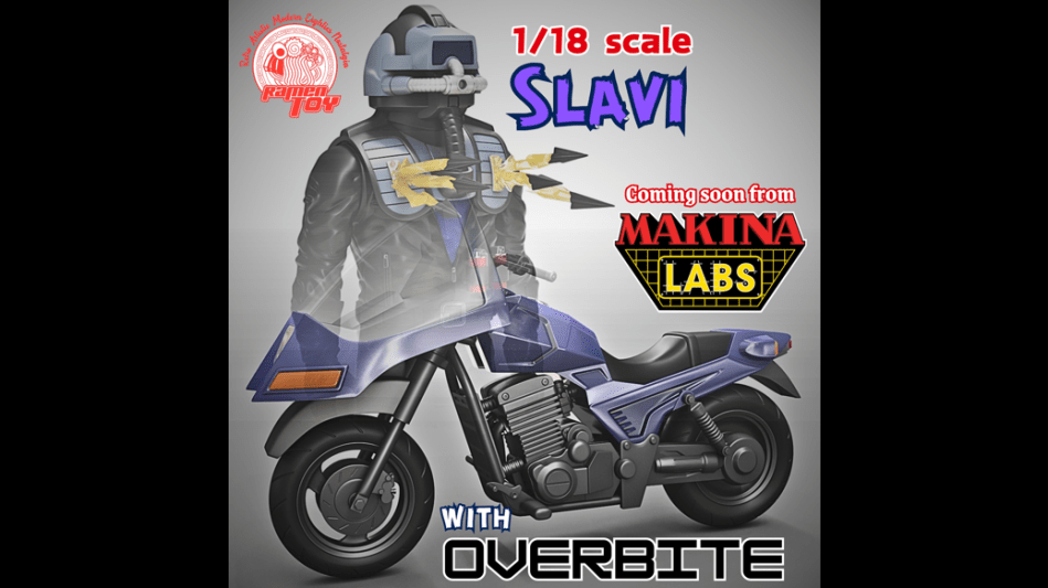 Heads up! This past Sunday, Ramen Toy shared word that they’d be expanding their Makina Labs line, a homage to M.A.S.K., into 1:18 scale with the announcement of Slavi with Overbite, coming soon to Makina Labs!