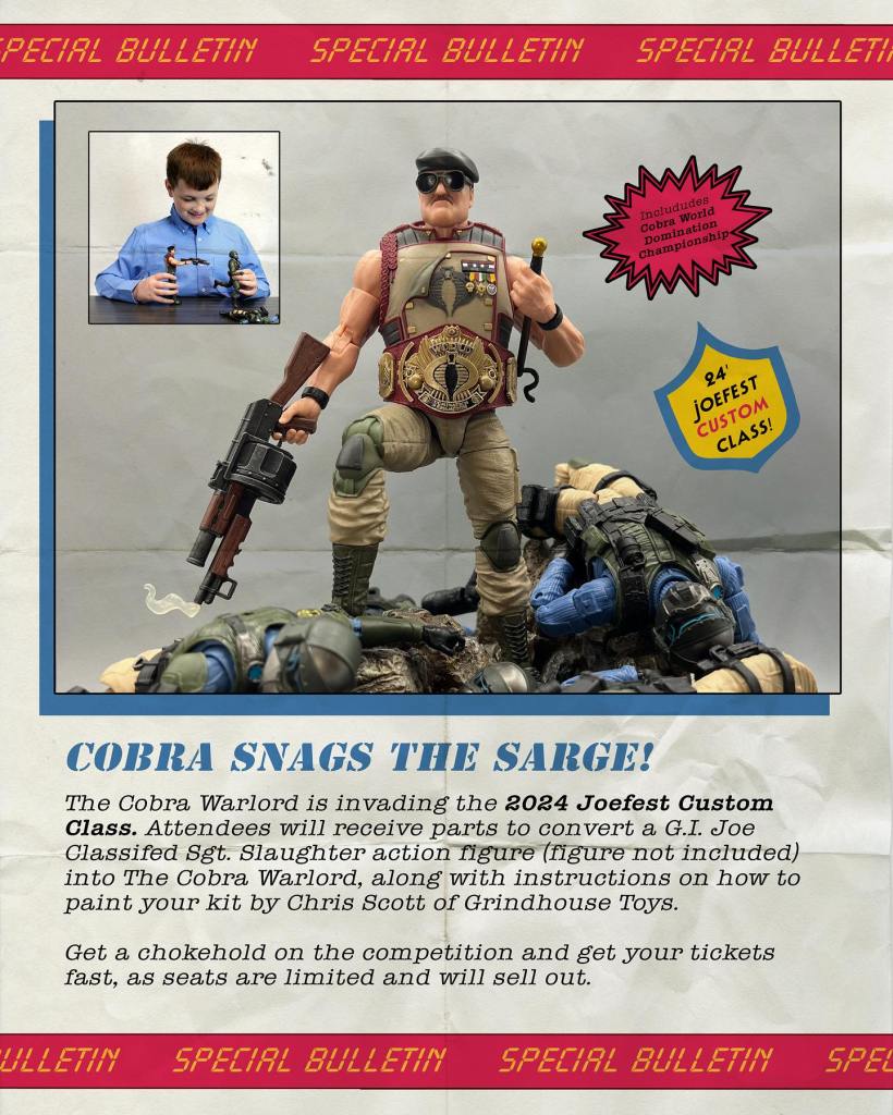 Grindhouse Toys will be providing kits to turn your G.I.Joe Classified Sgt. Slaughter action figures into the fearsome Cobra Warlord. Each kit includes a beret, vest, 40mm Ak grenade launcher, and Cobra World Domination Championship Title belt.