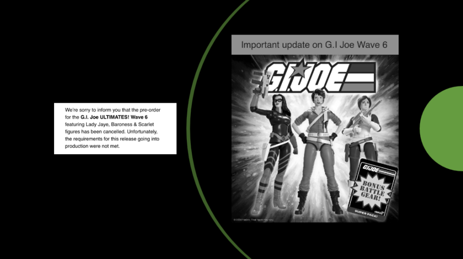 We’re sorry to inform you that the pre-order for the G.I.Joe ULTIMATES! Wave 6 featuring Lady Jaye, Baroness & Scarlet figures has been cancelled. Unfortunately, the requirements for this release going into product were not met.