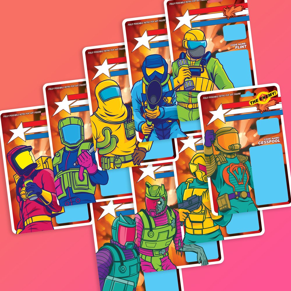 Featuring all five G.I. Joe Eco-Warriors (Deep-Six, Barbecue, Flint, Clean-Sweep, Ozone) along with their toxic “friends” from COBRA — Cesspool, Toxo-Zombie, Toxo-Viper and Sludge-Viper. Each card includes a custom file card on the back detailing the character’s bio, skills, personality and backstory.