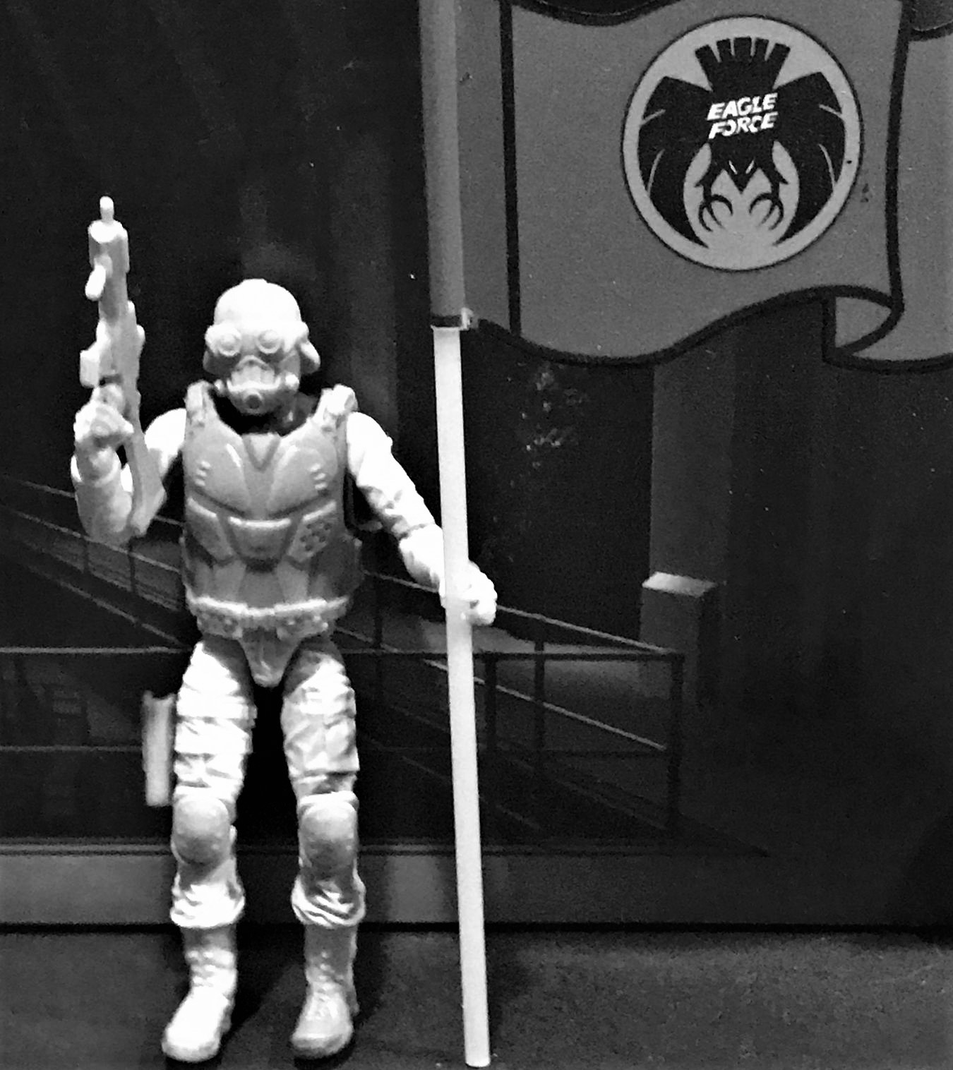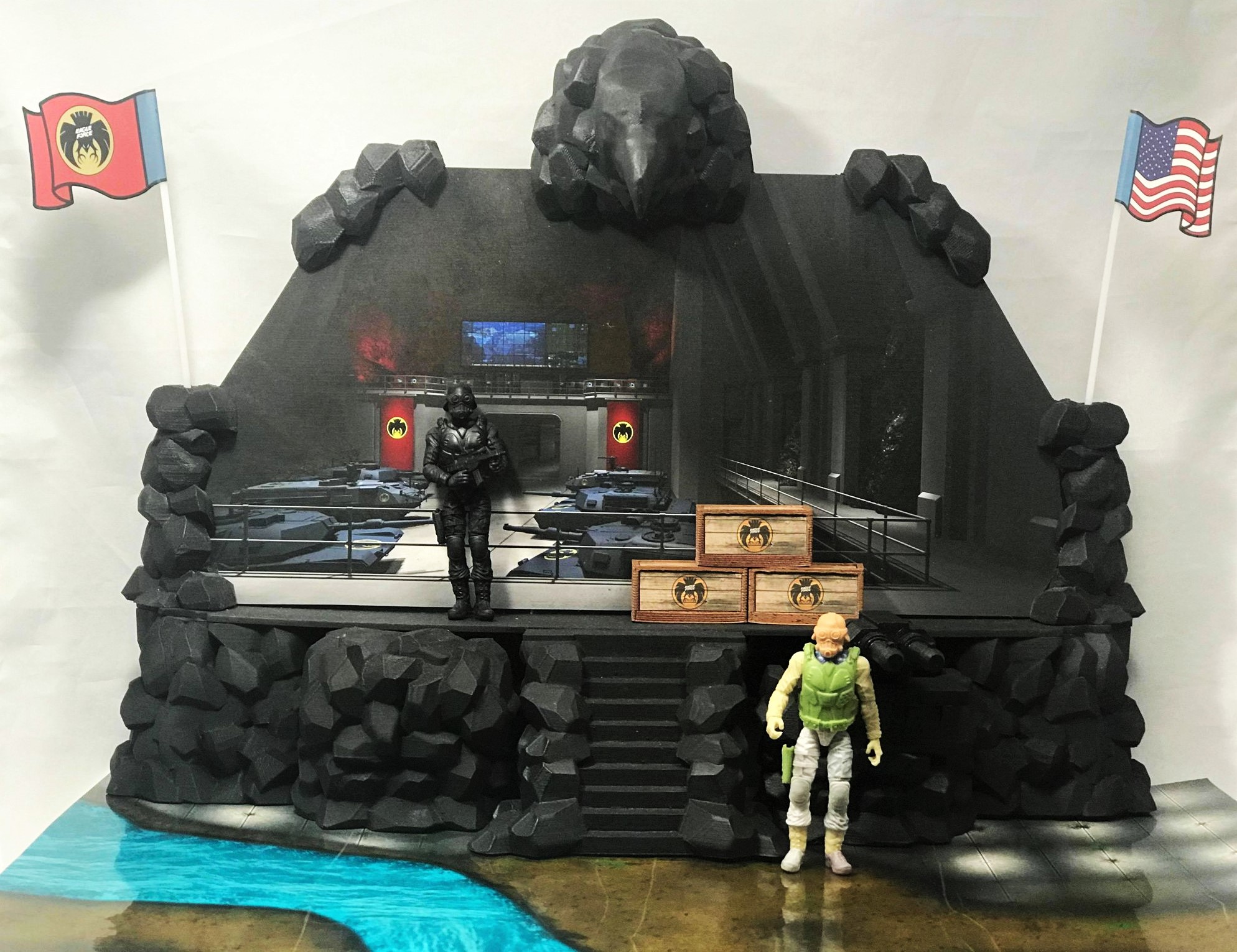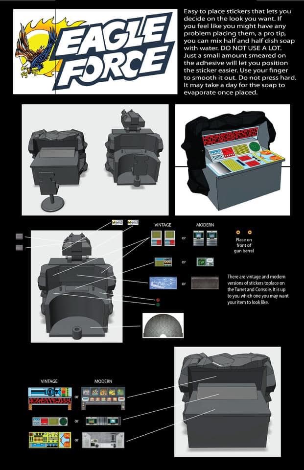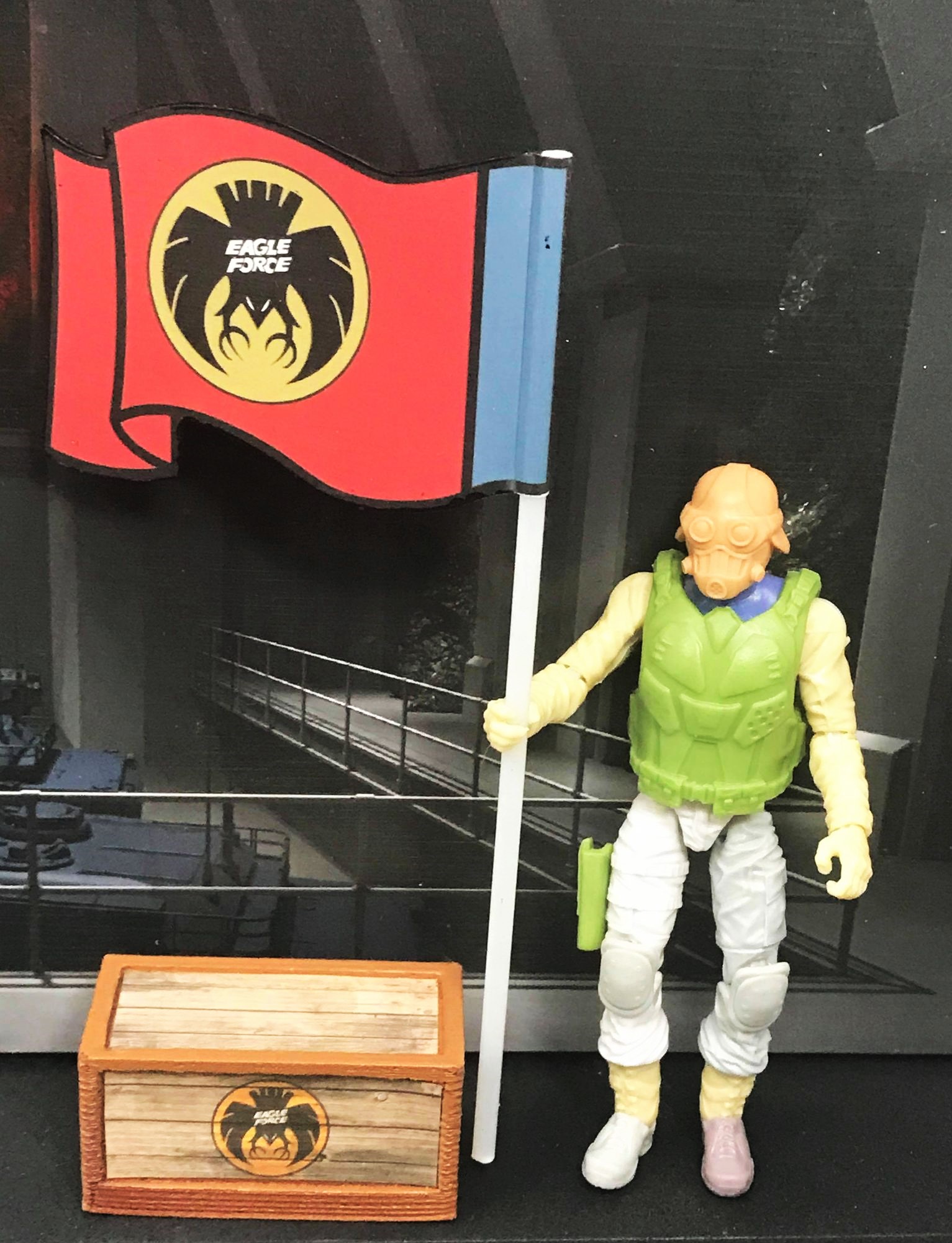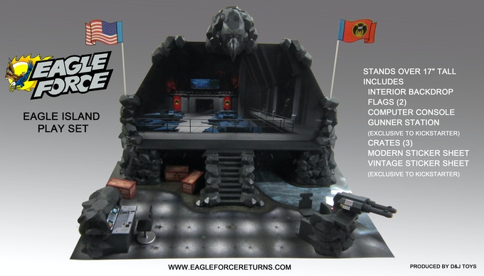 Plan your attack against the evil forces of R.I.O.T. from the Eagle Force headquarters on Eagle Island. Each limited edition playset will be built to order from D&J Toys and stands over 17″ tall. It includes a interior backdrop, flags (2) computer console, gunner station(exclusive to Kickstarter), crates (3), modern sticker sheet and vintage sticker sheet(exclusive to Kickstarter).