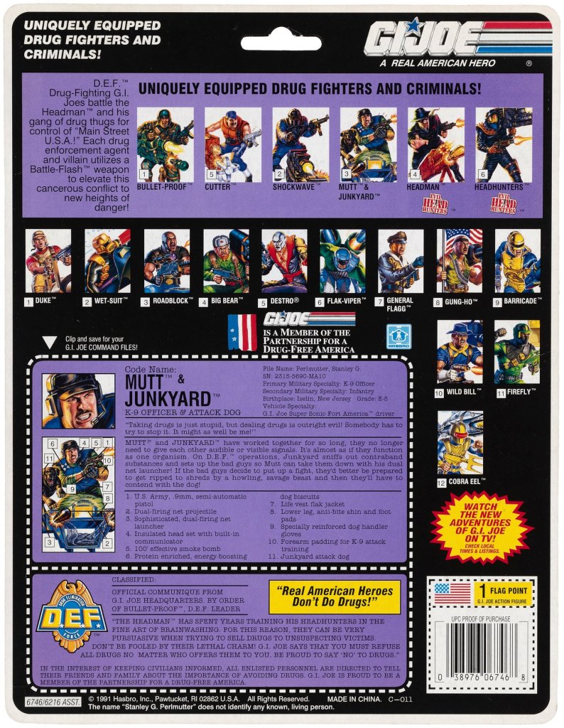 The extensive assortment of offerings related to the 1992 G.I.Joe Drug Elimination Force (DEF) Mutt and his companion, Junkyard. Mutt has always been one of my favorite characters, so in 1992 when he was released with a new sculpt, I was immediately in love.