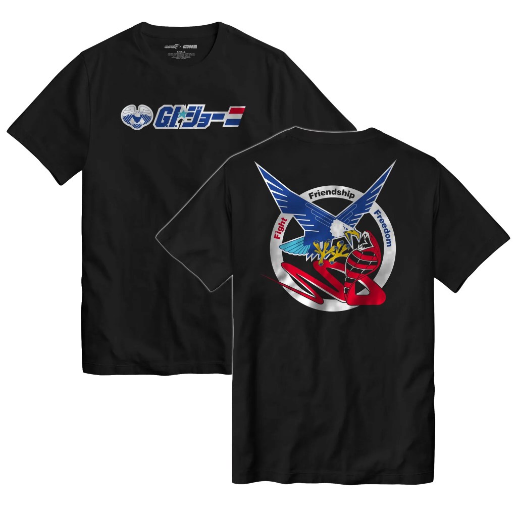 G.I. Joe’s fight against the tyranny of Cobra has found a global audience, with people from around the world identifying with the struggle! This JoeFest 2024 exclusive G.I. Joe Tee is inspired by the vintage, Japanese market G.I. Joe and features an eagle logo with “G.I. Joe” in Kanji script on the front, with a large graphic depicting an eagle and cobra engaged in a fight on the back. 100% cotton, machine washable, and available in black, sizes S-3X.
