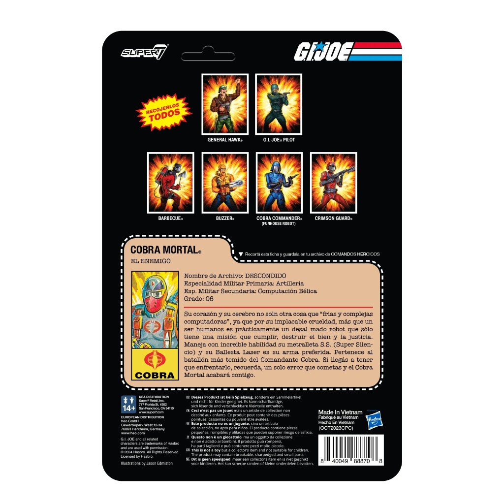 Most assassins need to blend in with their surroundings to accomplish their task and get away safely, but when you’re as good as Cobra Mortal, even a brightly colored uniform is no impediment to completing the mission! This 3.75” scale, articulated G.I. Joe ReAction Figure of Cobra Mortal is inspired by the vintage Argentine G.I. Joe action figure and features his signature red and chrome colorway, and comes with blaster and crossbow accessories. The vintage toy may be nearly as impossible to find as Cobra Mortal himself, so this is your best chance to capture the Cobra Mortal G.I. Joe ReAction Figure for your Cobra troop roster!
