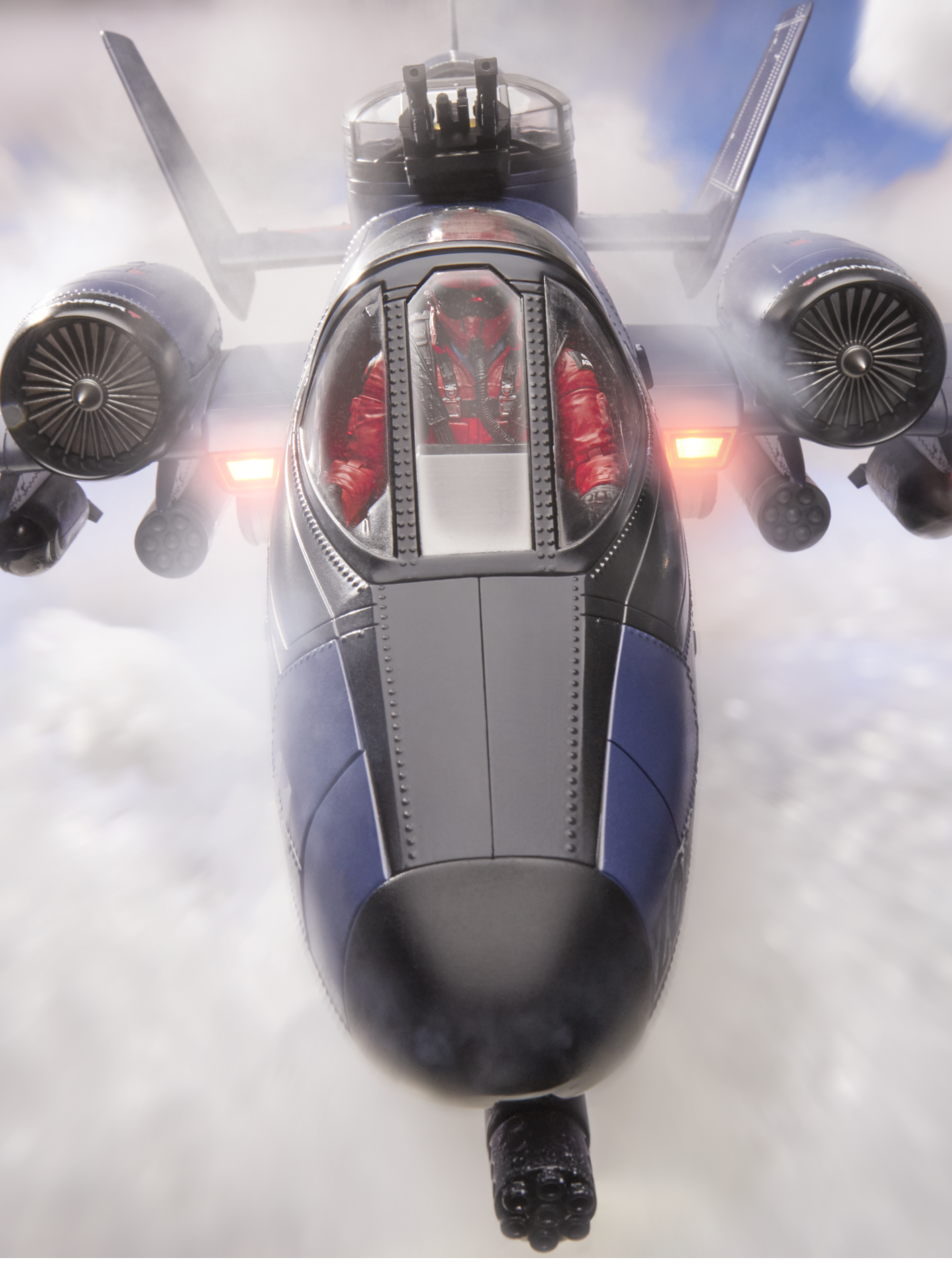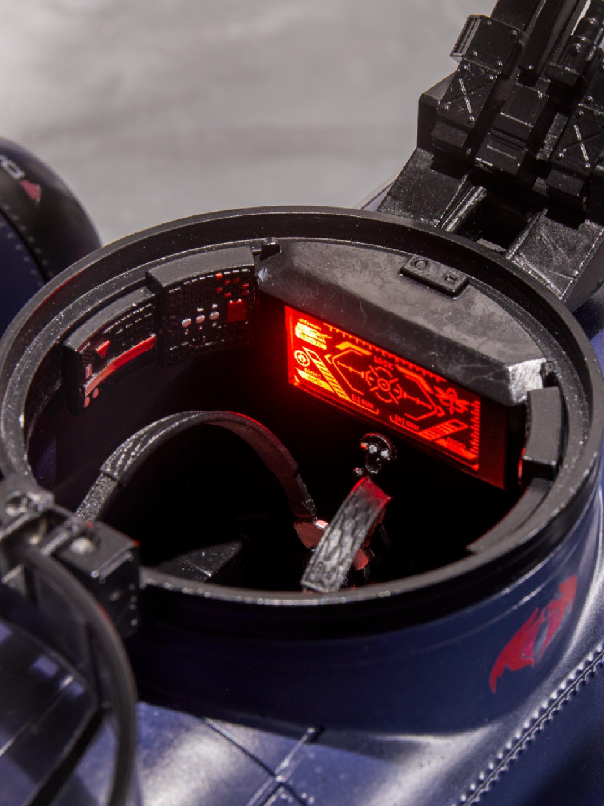 Entry to the cockpit comes via the stowable boarding ladder with foot peg which slides out of the fuselage. The rear of the two-part canopy hinges up granting access to the artificial snake-skin pilot seat, state-of-the-art controls, and illuminated Heads-Up Display (HUD). The cockpit which can accommodate most Classified Series figures features a 3-point harness, articulated control stick, and throttle.