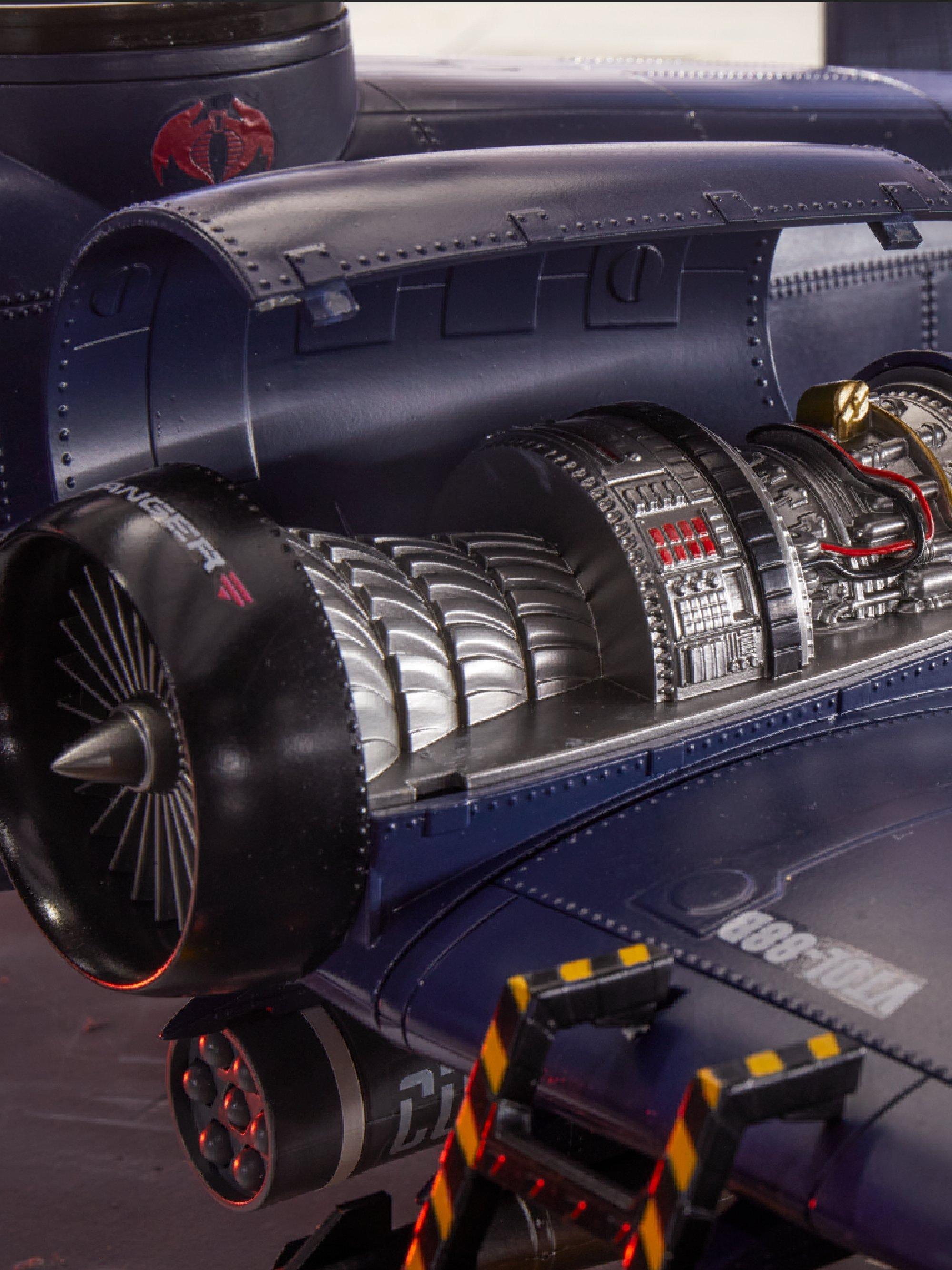 The exquisite detail and craftsmanship inherent in the Cobra Rattler evince themselves with several access panels that reveal its inner-workings. The aforementioned port-side battle-damaged plating readily swaps with an unmarred panel to meet your display and posing desires. Starboard side, a hinged panel reveals the Jawbreaker’s mechanisms and ammunition detail. An additional removable ladder affixes to either wing granting a posed figure access to the hinged engine cowlings and the turbofan engine detail beneath. Marvel at the technological superiority of the M.A.R.S. Industries-designed manually-spinning fans, compressors, turbines, and the combustion chamber.