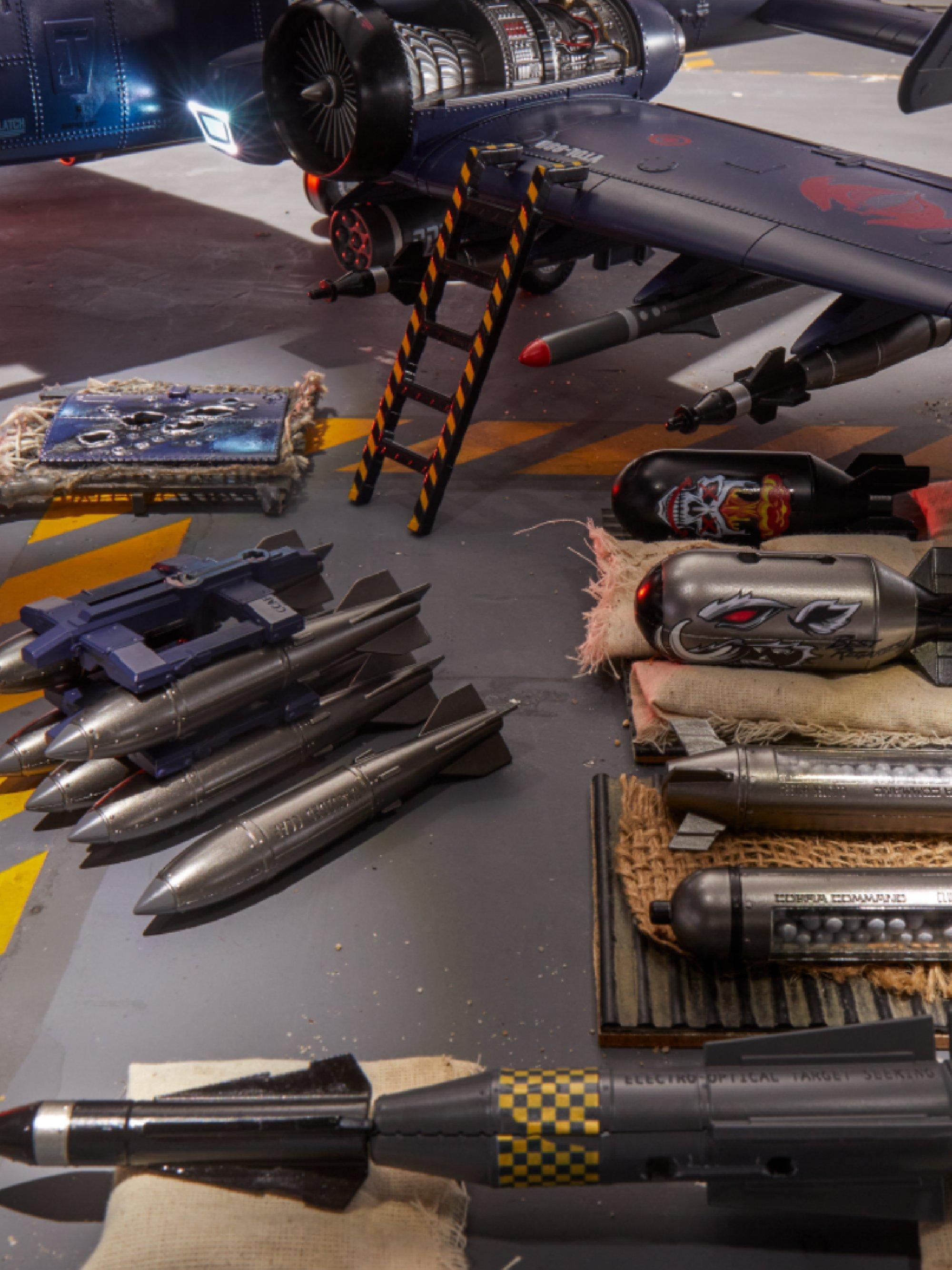 At each pilot’s disposal is a vast array of armaments to pound the Joe forces to rubble. 12 removable pylons attach under the wings offering dog bone connections to customize your jet’s weapons loadout. Choose from: