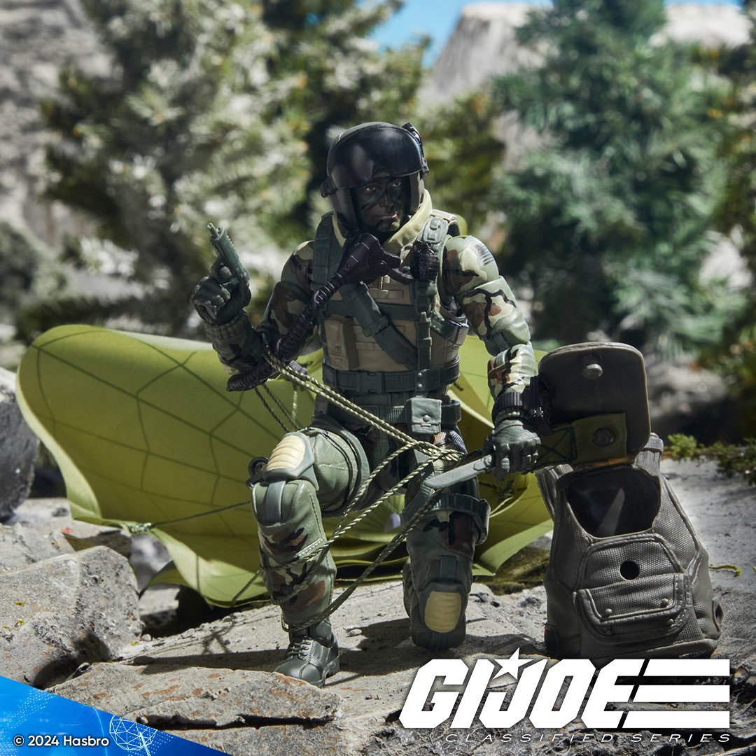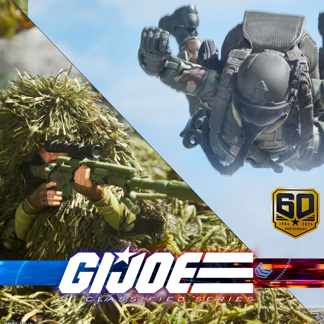 Yo Joe! #SDCC reveals coming your way to protect freedom and justice with G.I. Joe Classified Series 60th Anniversary Action Marine – Sniper and Action Pilot – HALO (High Altitude Low Opening) Jumper figures! Celebrate 60 year of G.I. Joe action with contemporary military designs bringing the rich history of G.I. Joe into the modern era. The Action Marine – Sniper figure features a Ghillie Suit and 19 character-inspired accessories including alternate head and hands, backpack, 2 swappable hat and hair pieces, and multiple weapons, while the Action Pilot – HALO Jumper figure features 18 character-inspired accessories including visored helmet with air hose, alternate helmet with night vision goggles, removable pouch, wrist altimeter, goggles, and multiple weapons, plus a foldable soft goods display parachute that can stow in the backpack.