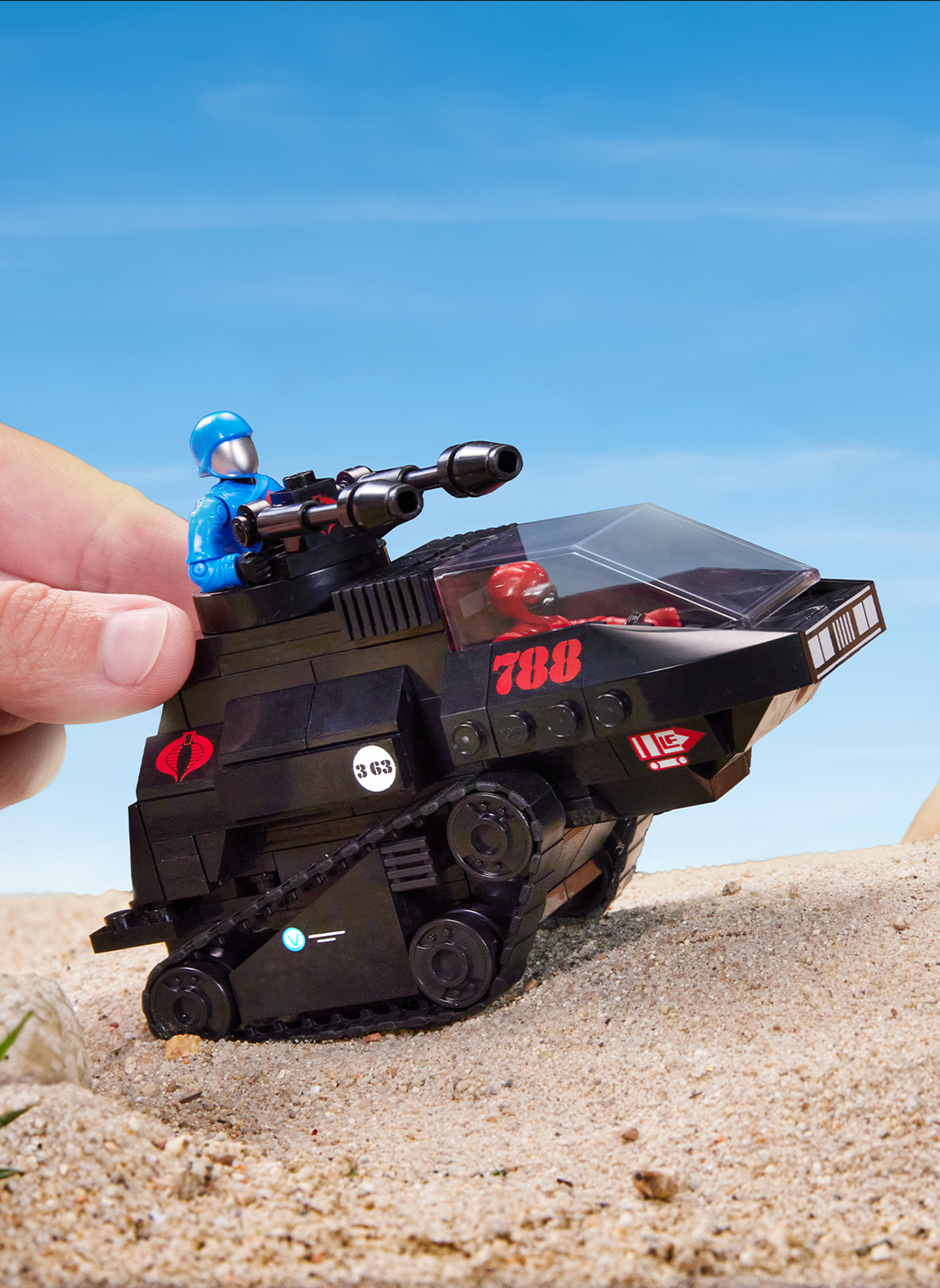 “Yo, Joe!” Relive epic rivalries and create exciting new adventures with our MEGA G.I. JOE Skystriker vs. COBRA H.I.S.S. building set. Inspired by the original ’80s designs, the two fully buildable vehicles feature authentic details and real moving parts. The four micro figures can be displayed individually on their nameplate stands or seated all at once in both vehicles for battling action on the ground and in the air.