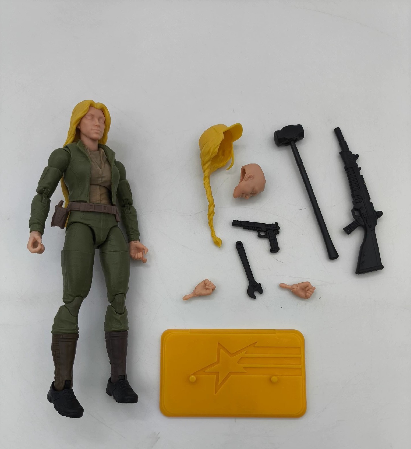 Retro Cover Girl comes to us with blonde hair (finally), but interestingly enough, her jacket is green and not brown. Maybe another release somewhere down the line will update that. Also, that sledge hammer is giving big tollbooth vibes.