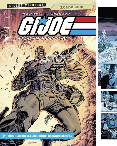 Today Skybound and Image Comics, in collaboration with leading games, IP and toy company Hasbro, revealed a first look at interior pages from G.I. JOE: A Real American Hero – Roadblock #1, the all-new one-shot debuting for Skybound’s Silent Missions month. Written and drawn by Andrew Krahnke (Bloodrik), with colors by Francesco Segala (G.I. JOE: A Real American Hero), this issue hits comic book shops on April 23.