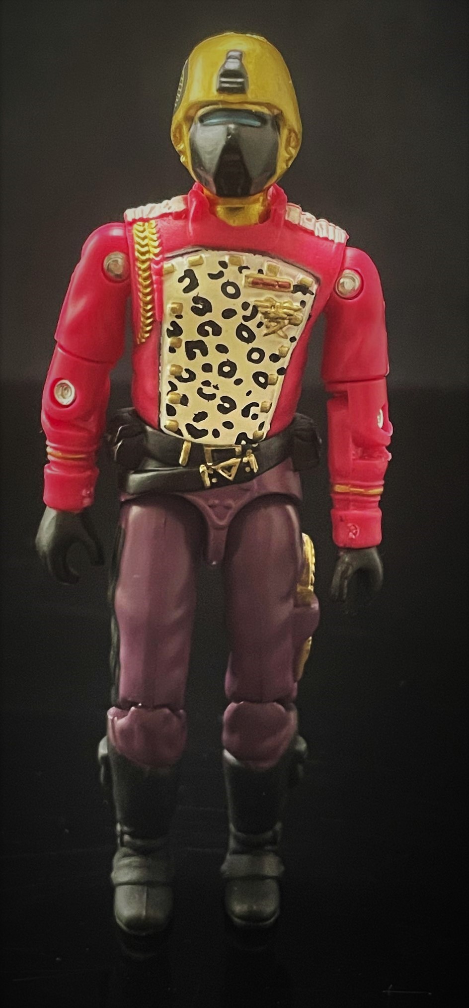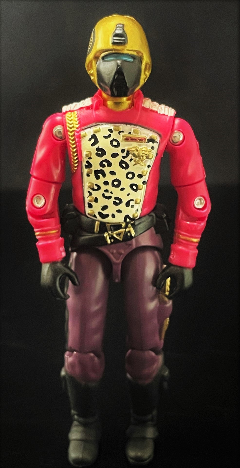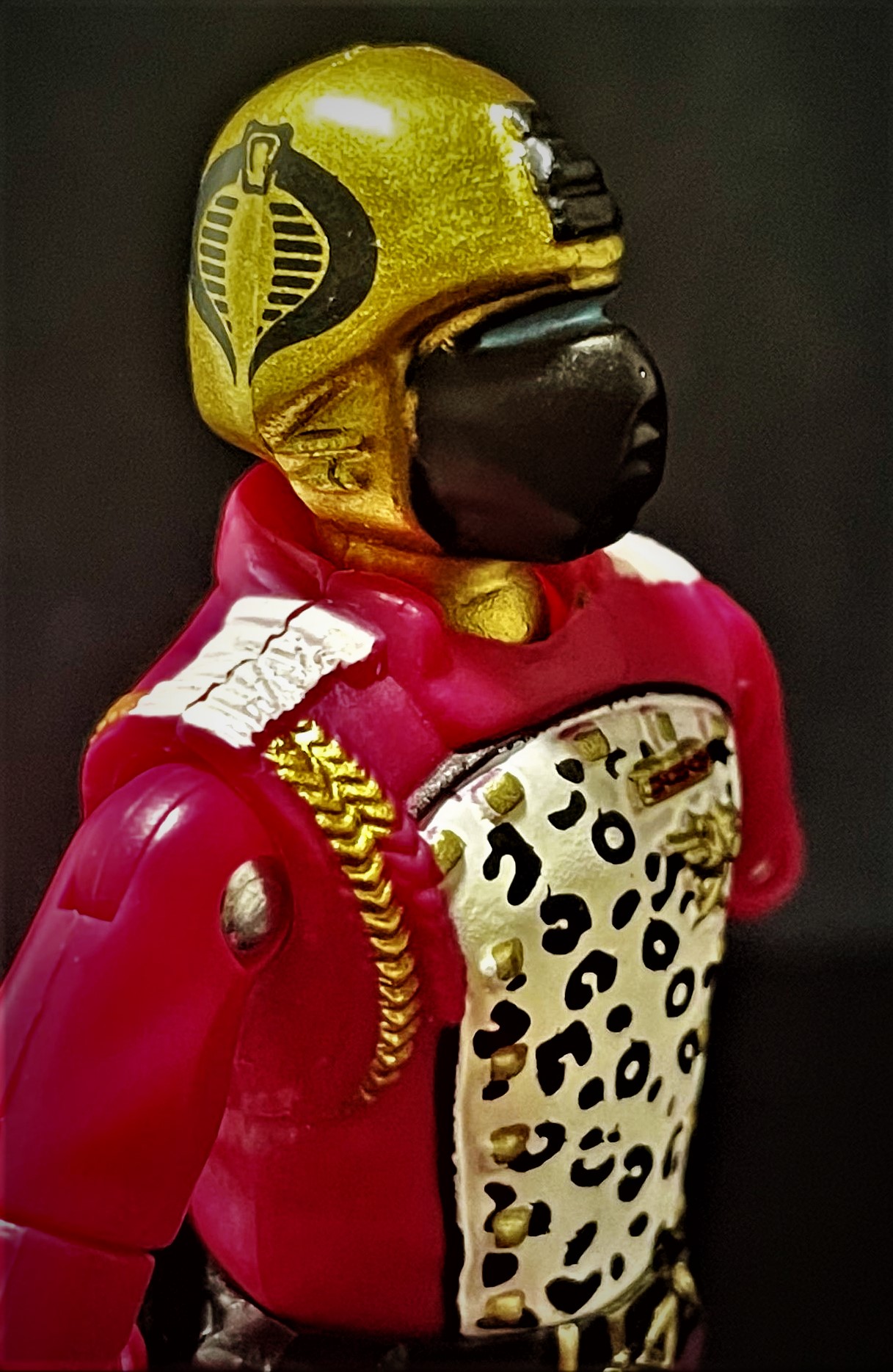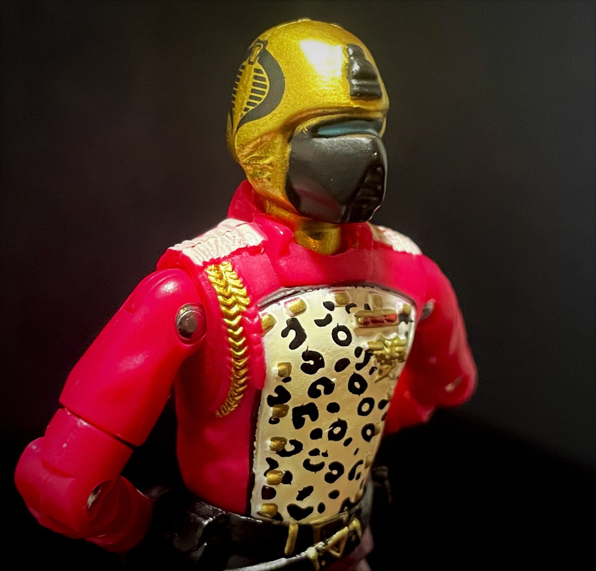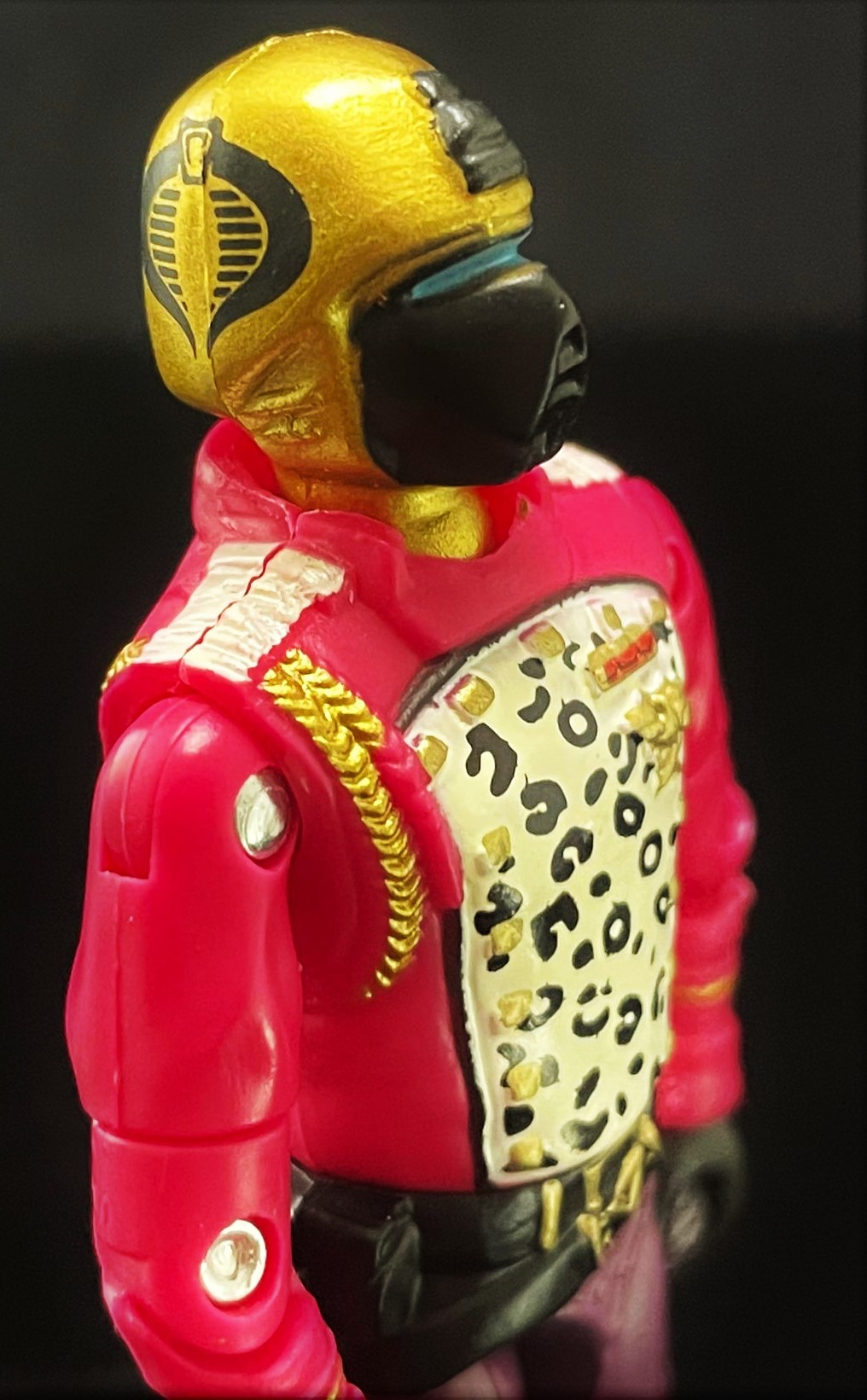 The Pimp Daddy deco really works well on the Crimson Guard mold, with leopard print just popping against the hues of red and plum, with gold highlights and a flat black that really ties everything together. The Gold CG helmet with that big Cobra Logo are just fun to look at, isn’t it?