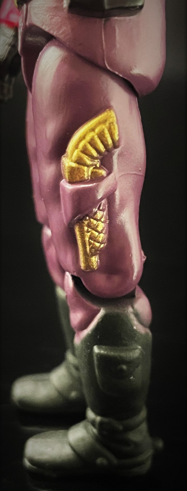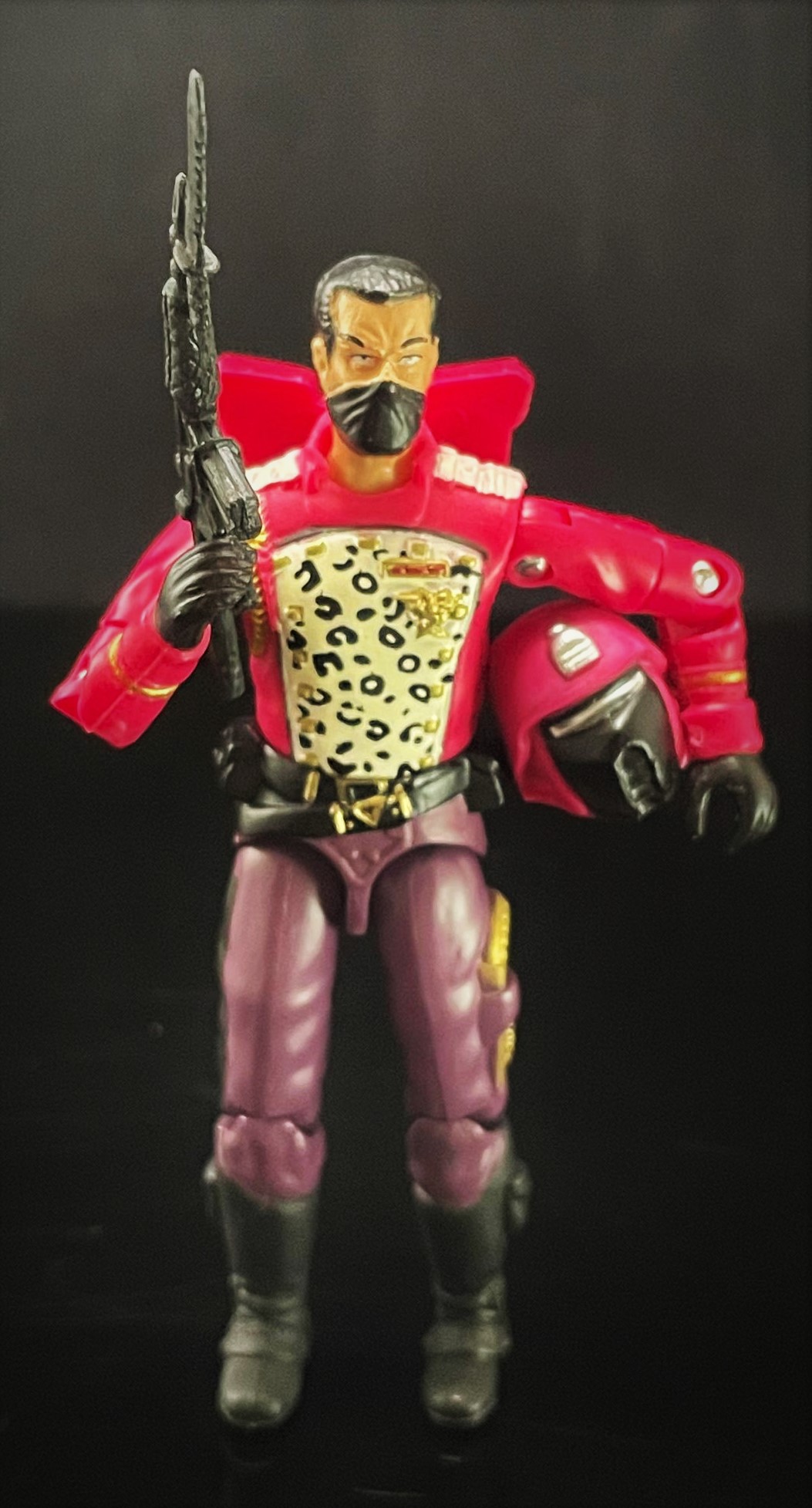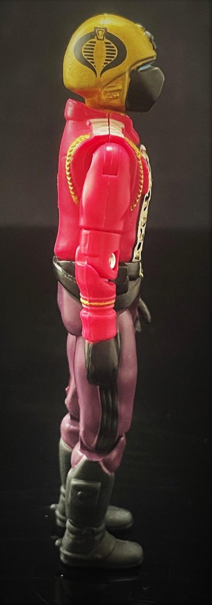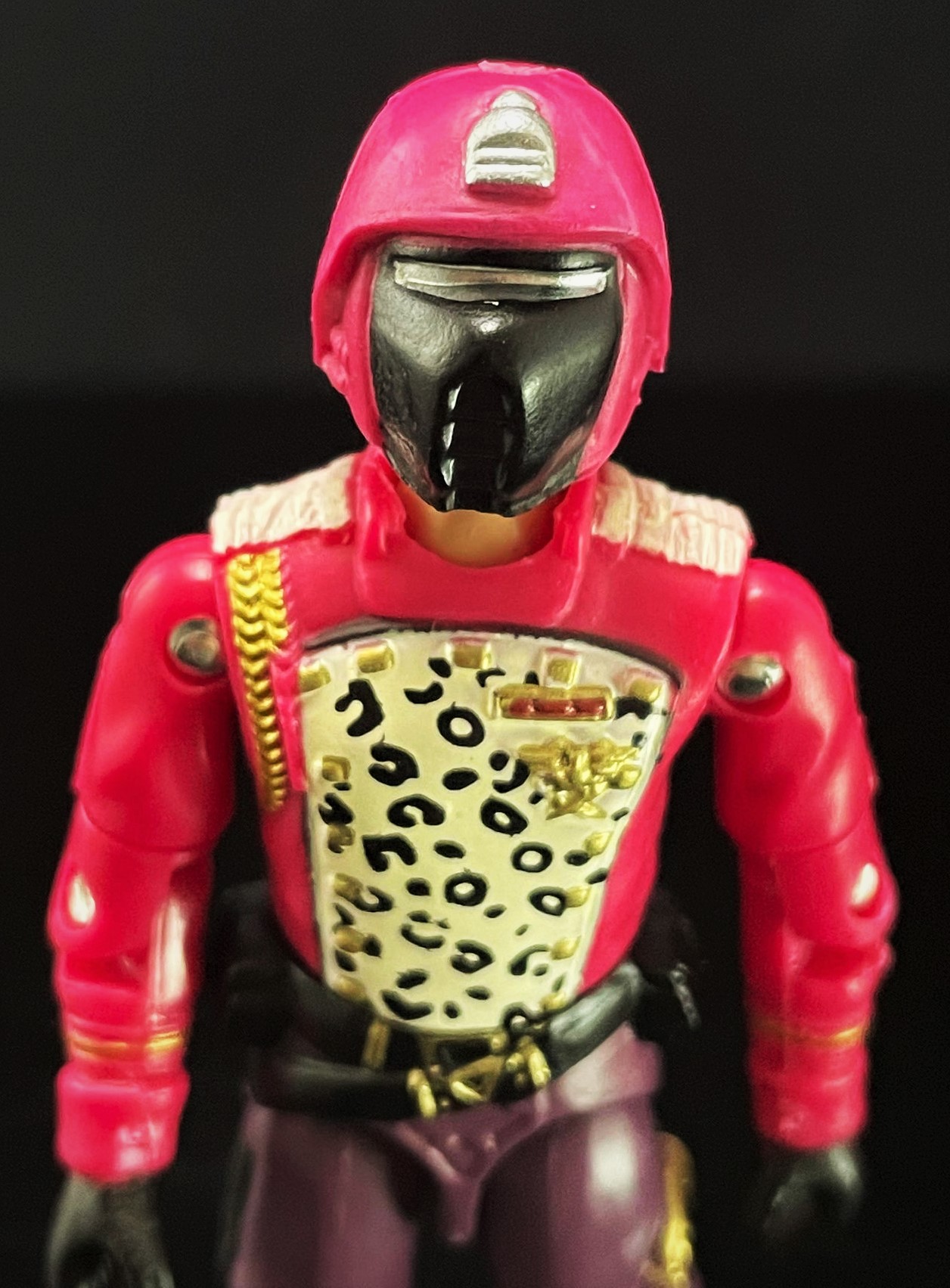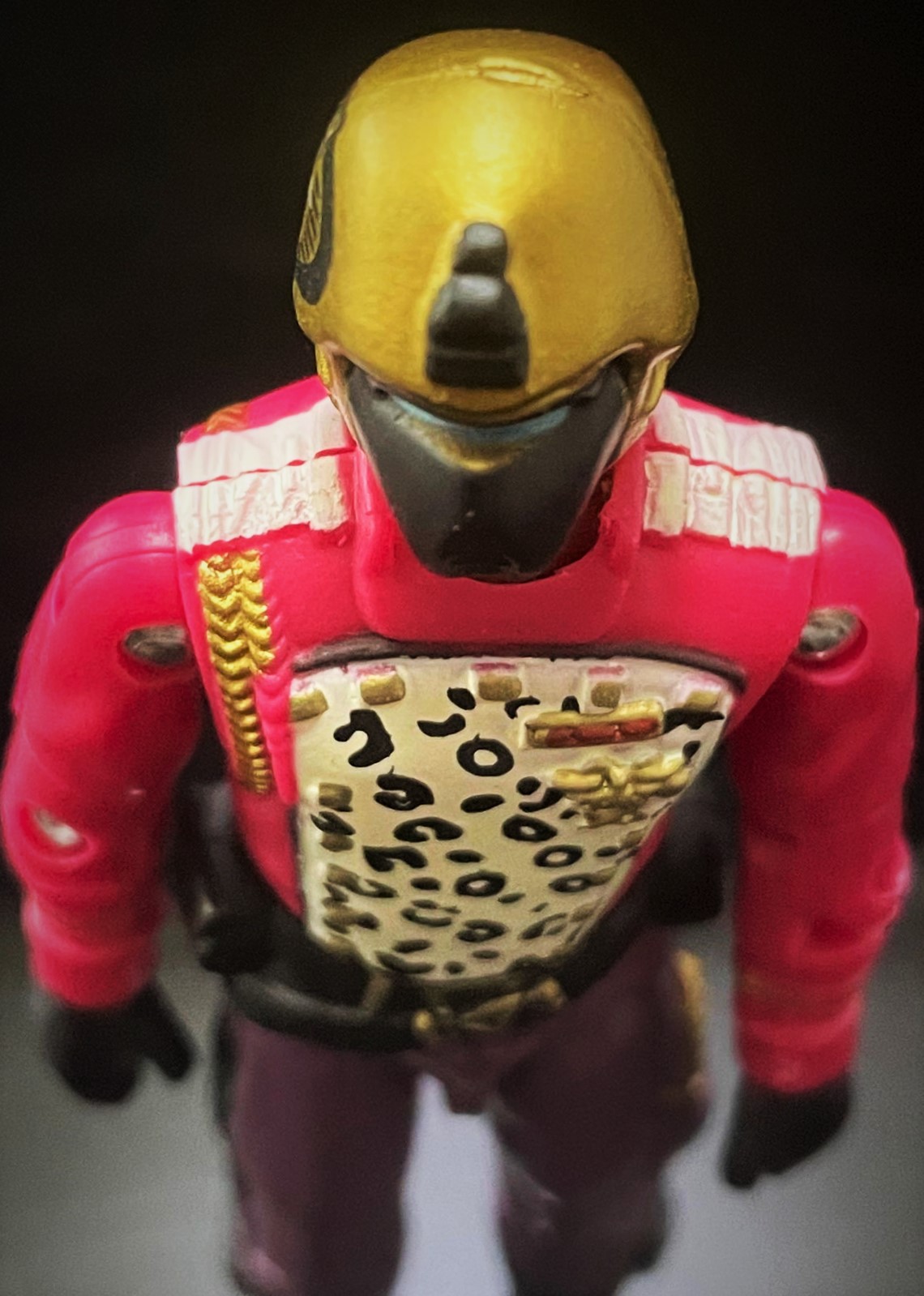 The Pimp Daddy deco really works well on the Crimson Guard mold, with leopard print just popping against the hues of red and plum, with gold highlights and a flat black that really ties everything together. The Gold CG helmet with that big Cobra Logo are just fun to look at, isn’t it?