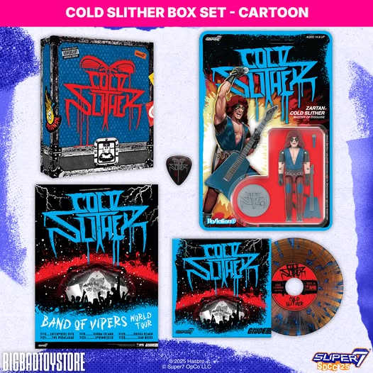 Super7 has revealed a 3rd version of their ReAction+ Cold Slither Box Set, this time exclusive to BigBadToyStore. This latest drop, the “cartoon” version, includes Zartan, the adapter, record and poster closely resembling his ARAH color scheme. Check it out –