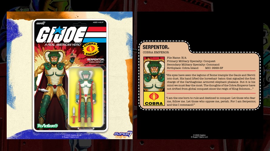 It was back at JoeFest 2025 when Super7 gave us our first look at their upcoming SDCC 2025 Exclusive ReAction+ G.I.Joe offerings – Their Time Bomb Cobra B.A.T. based on Marvel’s G.I.Joe A Real American Hero #53 and Serpentor, a repaint reflecting his DiC color scheme.