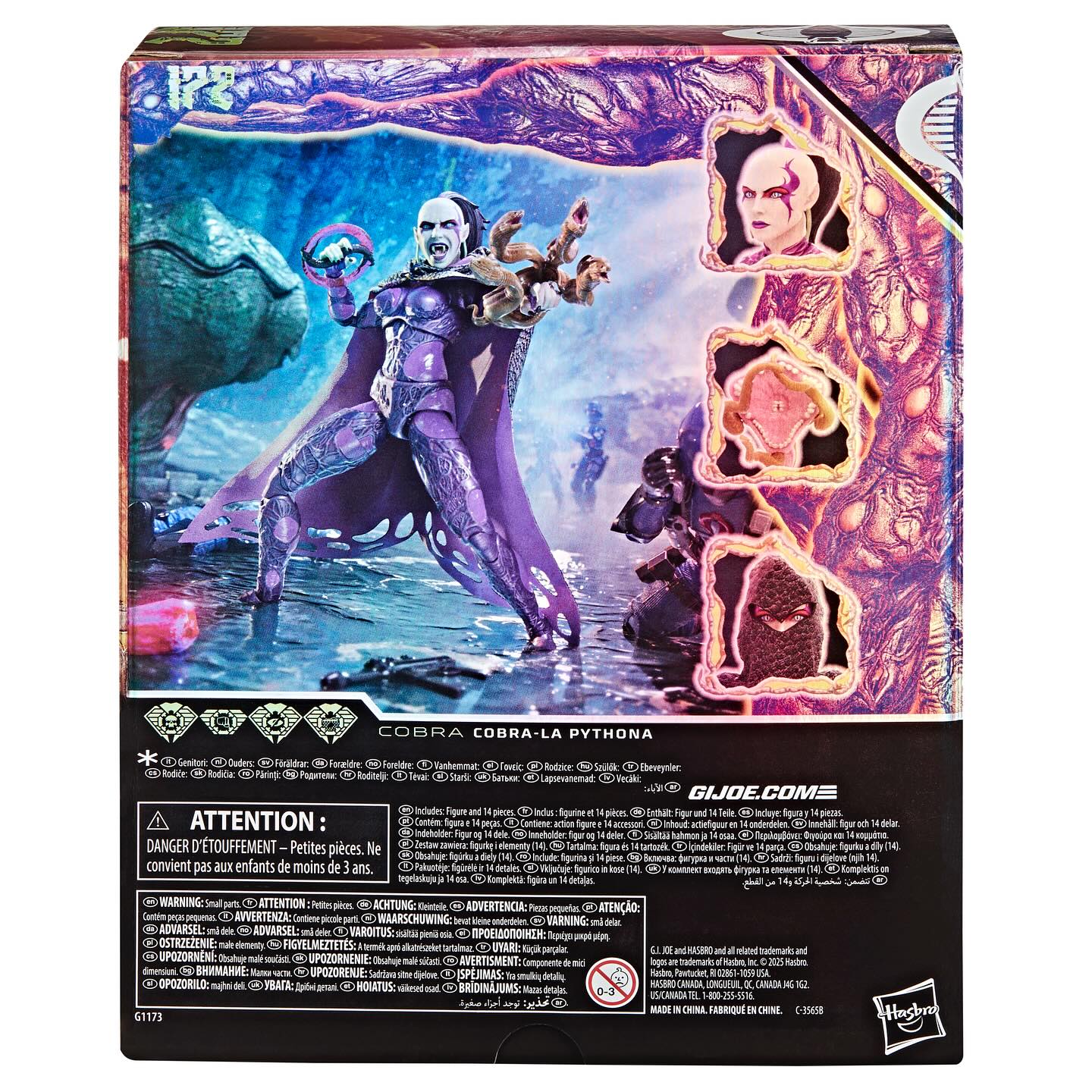New to the G.l. Joe Classified Series line, Cobra-La Pythona comes ready for adventure, with multiple points of articulation for high poseability. This Cobra-La Pythona figure contains 14 character and G.l. Joe: The Movie-inspired accessory pieces including a gem, alternate head with ponytail, 2 chakrams, 2 fists, hand with poison effect, hand with smoke effect, and 5 bio-mechanical creature accessories which Pythona employs as weapons.