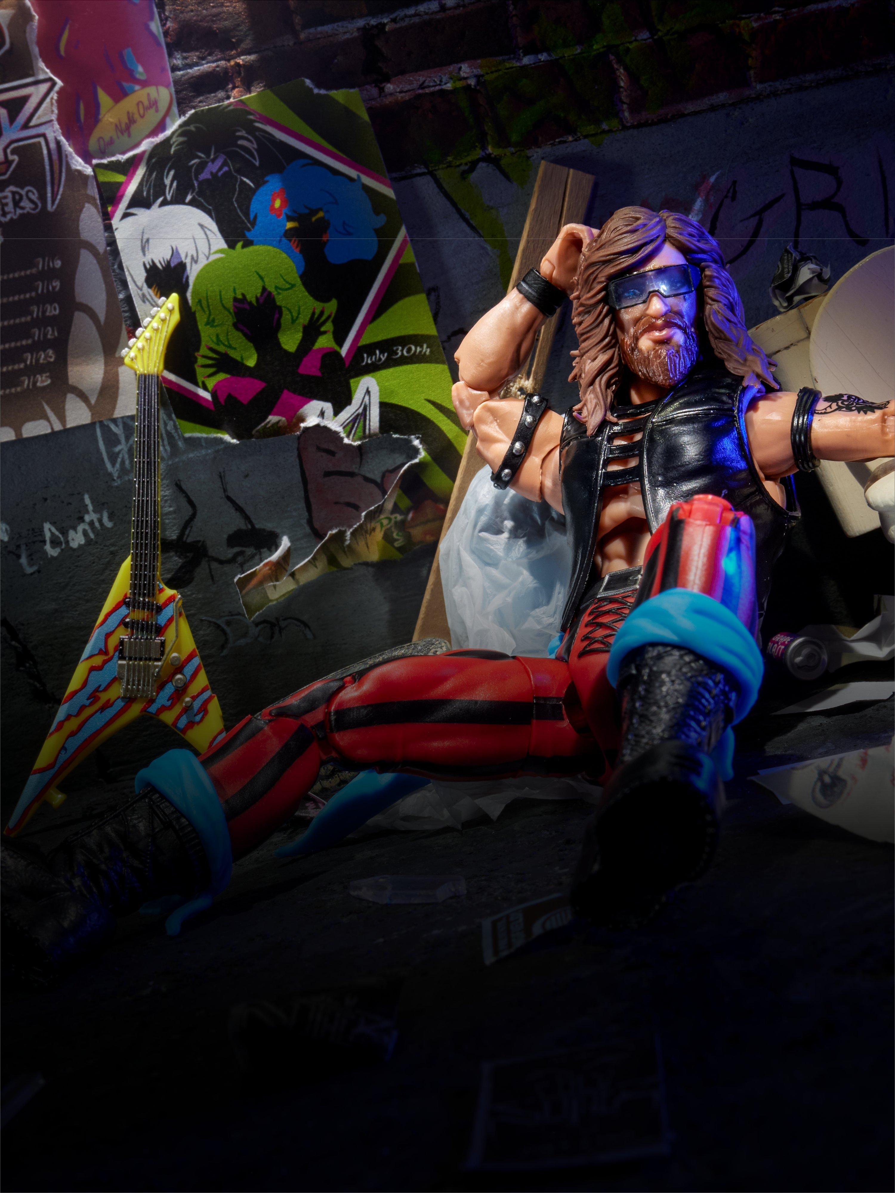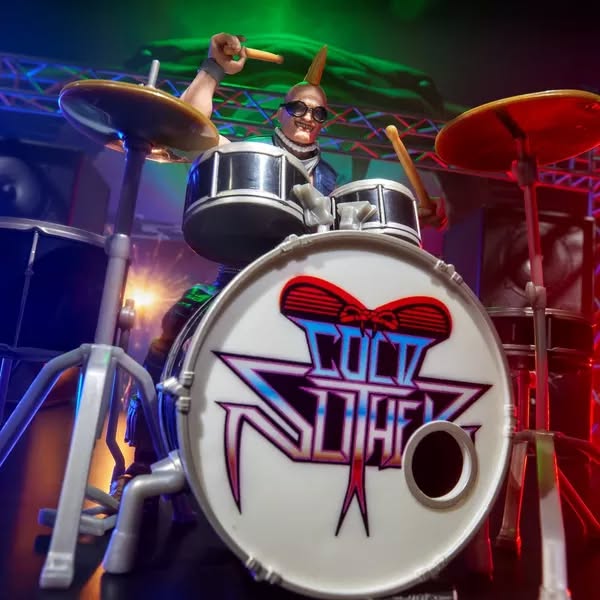 Each Cold Slither figure in the set includes his iconic instrument. The package is bursting with 29 musical accessories including guitar, bass, keytar, 5 instrument straps and a full 6-inch-scale drum kit complete with floor tom, hi hat with pedal, hi tom, mid tom, bass drum with kick pedal, stool, 2 drumsticks, snare drum, cymbals and stands. Buzzer rocks removable glasses and a neckerchief.