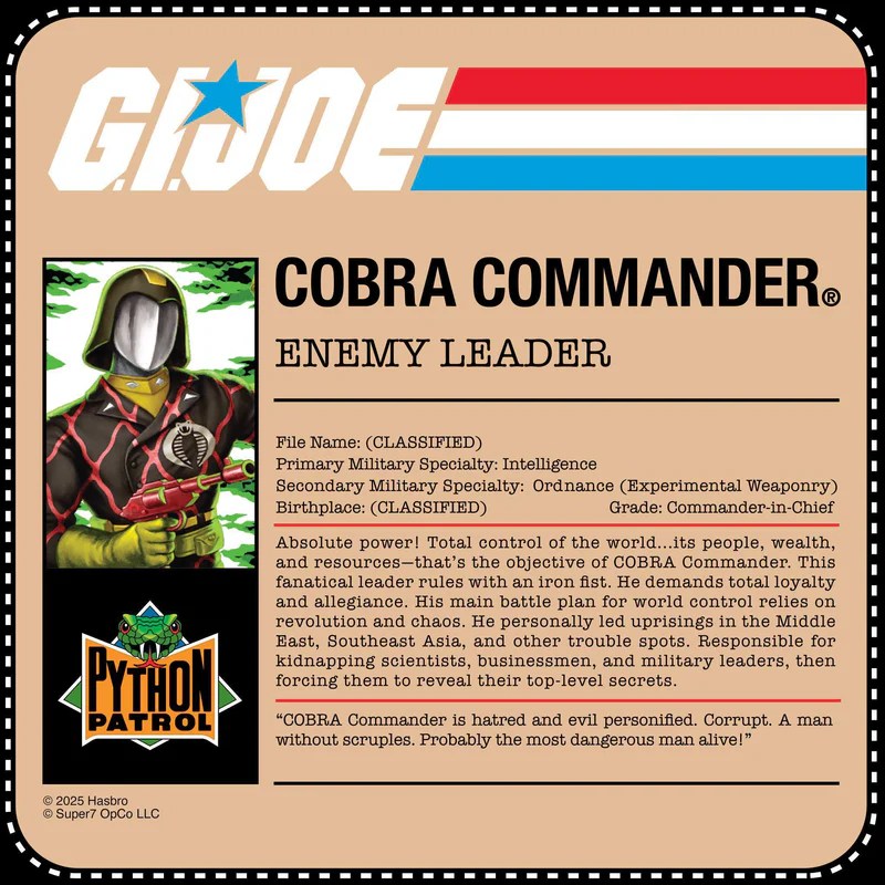 Cobra is ready to strike! The Python Patrol Cobra Commander storms into action as a 3.75” scale ReAction+ Figure, ready to bring cold, calculated destruction to the G.I. Joe team.