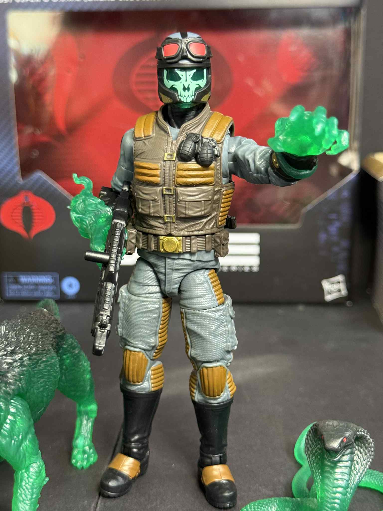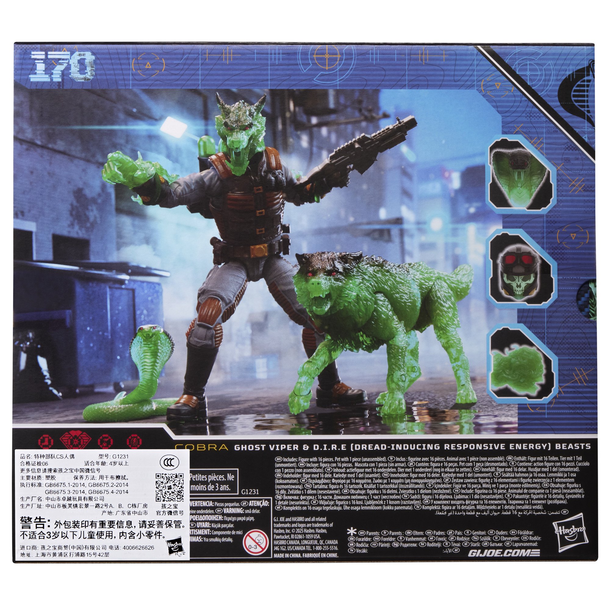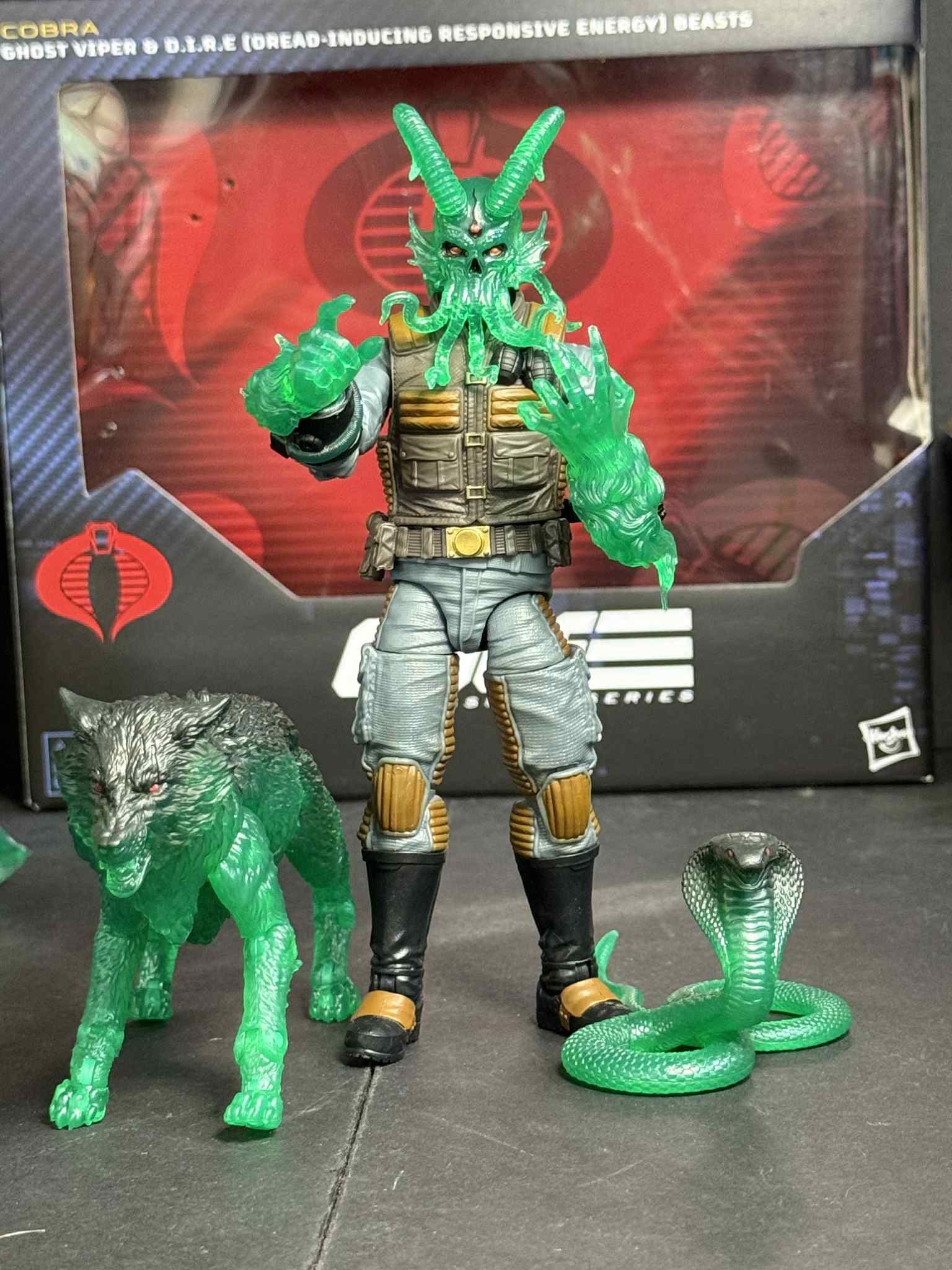 New to the G.I. Joe Classified Series line, Ghost Viper & D.I.R.E. (Dread-Inducing Responsive Energy) Beasts come ready for adventure, with multiple points of articulation for high poseability. This Ghost Viper figure contains 16 character-inspired accessory pieces including D.I.R.E. Containment Pack, hose, Projector, alternate helmeted head, goggles, alternate hooded cobra and werewolf spectral head manifestations, 2 D.I.R.E. claws, 2 gas effects, skull projection effect, D.I.R.E. snake, and weapon accessories; plus a fully-articulated D.I.R.E. wolf figure with alternate head. Ghost Vipers and D.I.R.E. Beasts are the front line of Cobra’s supernatural troopers recklessly unleashing forces they can’t begin to fully comprehend.