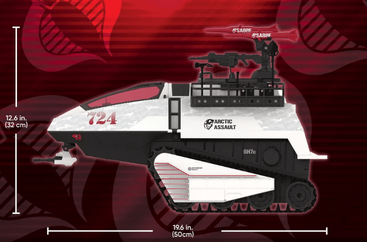 Lean and sleek, the Arctic Assault H.I.S.S. measures 19.6″ (50 cm) long and stands 12.6.” (32 cm) tall. The single cockpit seat affords a narrower silhouette than the Joe’s SnowC.A.T. while still providing ample rear cargo storage and troop transport at a mere 9″ (22.9 cm) wide.