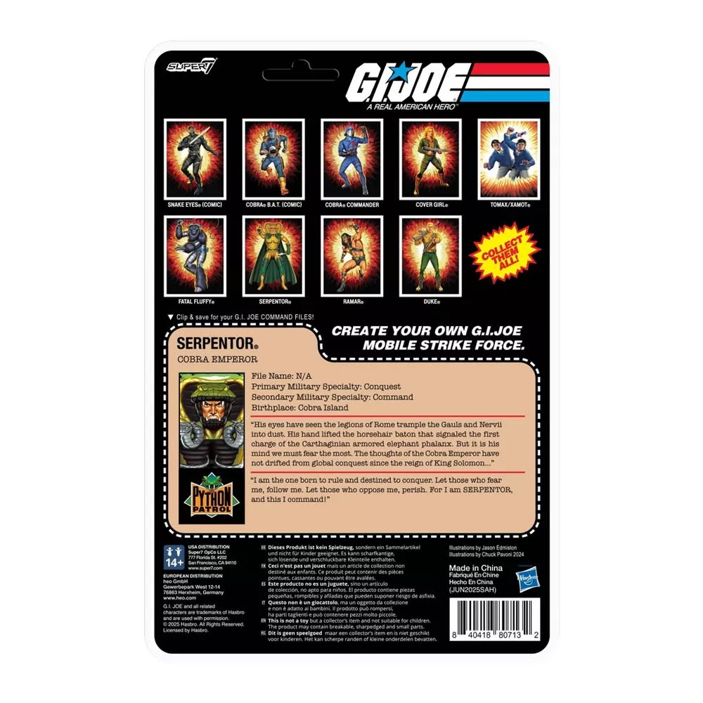 Blunderers and fools, stay out of Serpentor’s way! This Python Patrol member is ready to strike as a ReAction+ figure in a new colorway. Born on Cobra Island, and genetically engineered from the DNA of notable villains and conquerors, Serpentor is “born to rule, destined to conquer.” Inspired by the G.I. Joe series character, this ReAction+ Figure has 12 points of articulation and is 3.75” scale. Designed to look and feel like vintage toys from the early ‘80s, this action figure features O-ring construction for ultimate pose-ability. A signature dagger accessory completes the look, along with a soft goods cape. The blister card-back packaging also features original Super7 artwork, inspired by the G. I. Joe series. With such a commanding presence, this ReAction+ figure of Serpentor might have you saying, “Hail, Serpentor” in no time.